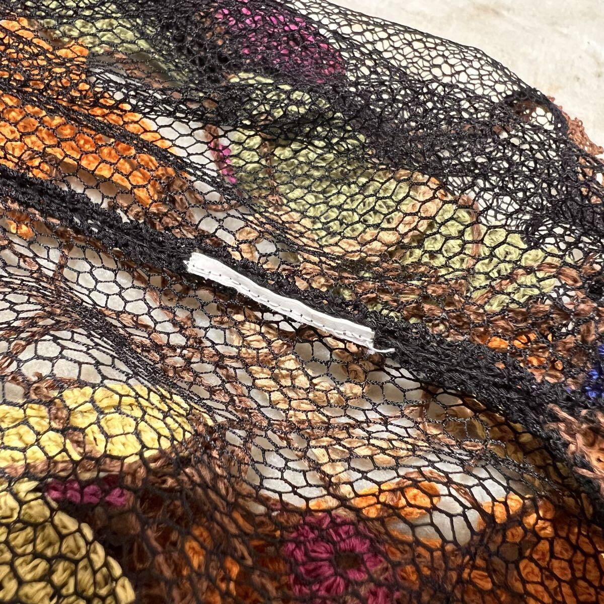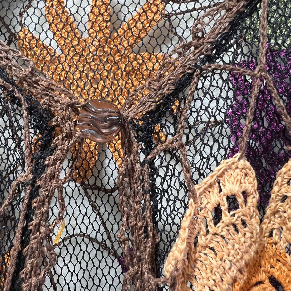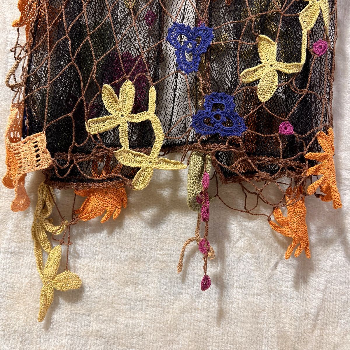 素材表記:タグなし(見た目は化繊メッシュ+かぎ針編み糸の組み合わせ)