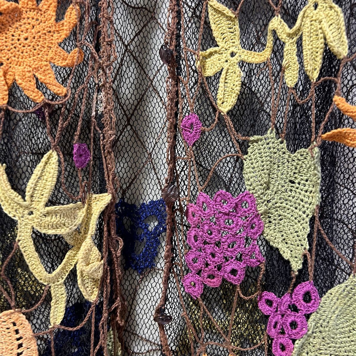 黒×ブラウンのメッシュ地に、手編みの花・葉・ツタのモチーフを全面に配置。