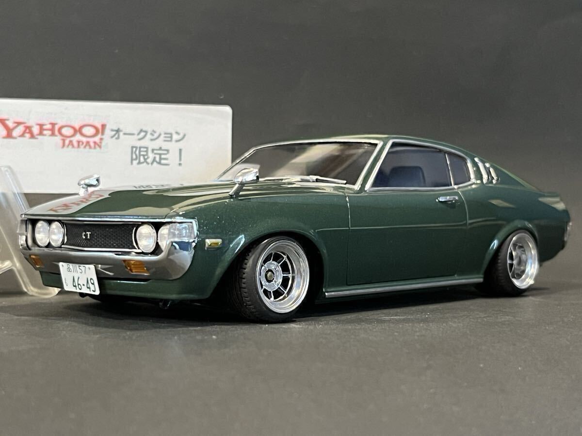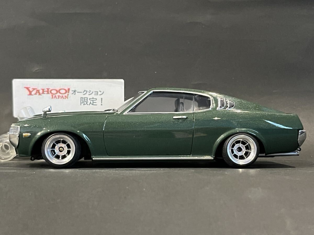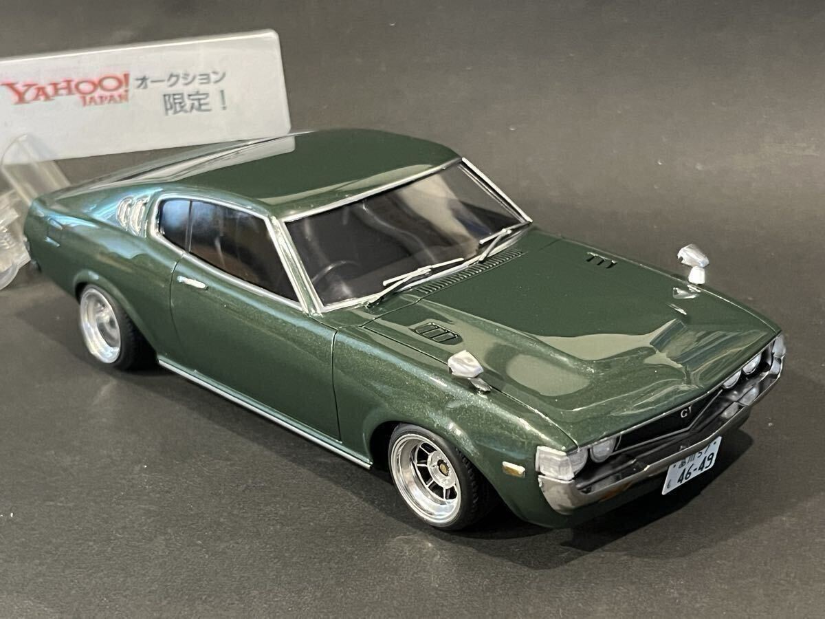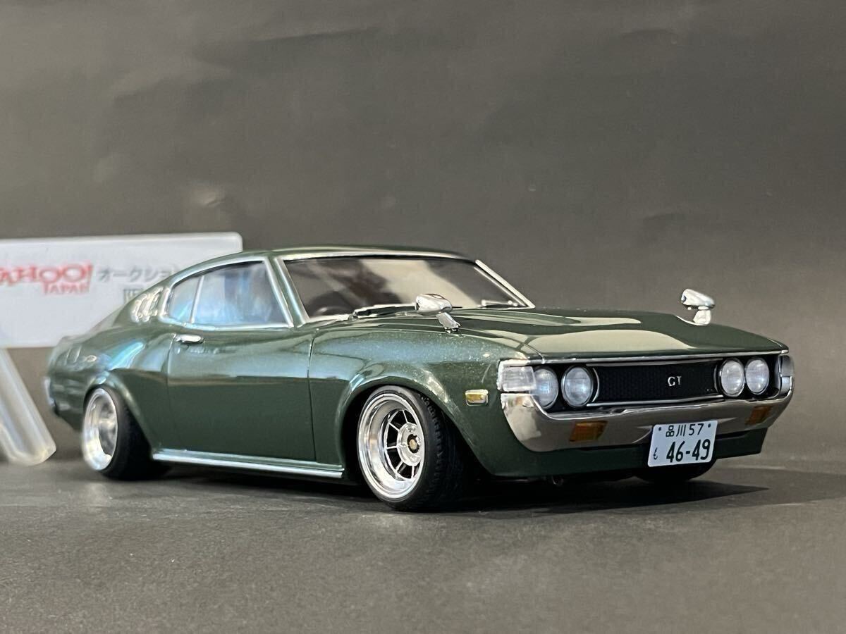 ご覧いただきましてありがとうございます。アオシマ製セリカLBのプラモデル組立完成品を出品いたします。写真にはありませんが飾台付きです(ダイソーコレクションBOX)。不要になりましたので出品致します。ボディは下地を整えてからグリーンメタに塗装してみました。クリアー塗装後、研ぎ出してからコンパウンドで仕上げてあります。外観の改造個所はサイドのモール、エンブレム類を取り外した状態にしています。フロントグリルですが、このキットはそのまま組むと暗い雰囲気になってしまいますので、ヘッドライトにリフレクターを仕込んで、ハセガワのダルマセリカのレンズでリアル感を増してみました。内装はセミグロスブラック一色に塗装してあり、コンソール、インパネなどの表現はしていません。ハンドルはキット付属のパーソナル?に交換しました。シートも運転席はバケットにしてあります。タイヤは同社のアドバンレイン風タイヤ。ホイルも同社のハヤシです。センターキャップを取り外した状態に加工して、テカテカのメッキを剥離してアルミホイルに見えるように塗装で表現してみました。タイヤは4輪とも固定でステアも回転もしません。シャーシ裏面は仕上げてありません。一部荒くカットしたり削ったりしてあります。マフラーは出口だけ直管風にしてあります。以上、ディスプレイ重視の完成品です。ムラ、キズ、磨き残し、ゴミ噛み、ボンド跡、などなど、粗がございますが、いかがでしょうか?商品はダイソーのコレクションBOXになるべく破損しにくいように梱包して発送致します。 万が一破損していた場合でも保障は出来ませんのでご理解できる方のみご入札願います。発送はヤマト運輸の宅急便EASY80サイズにて発送予定です。送料はご負担願います。 以上NCNRでお願いいたします。