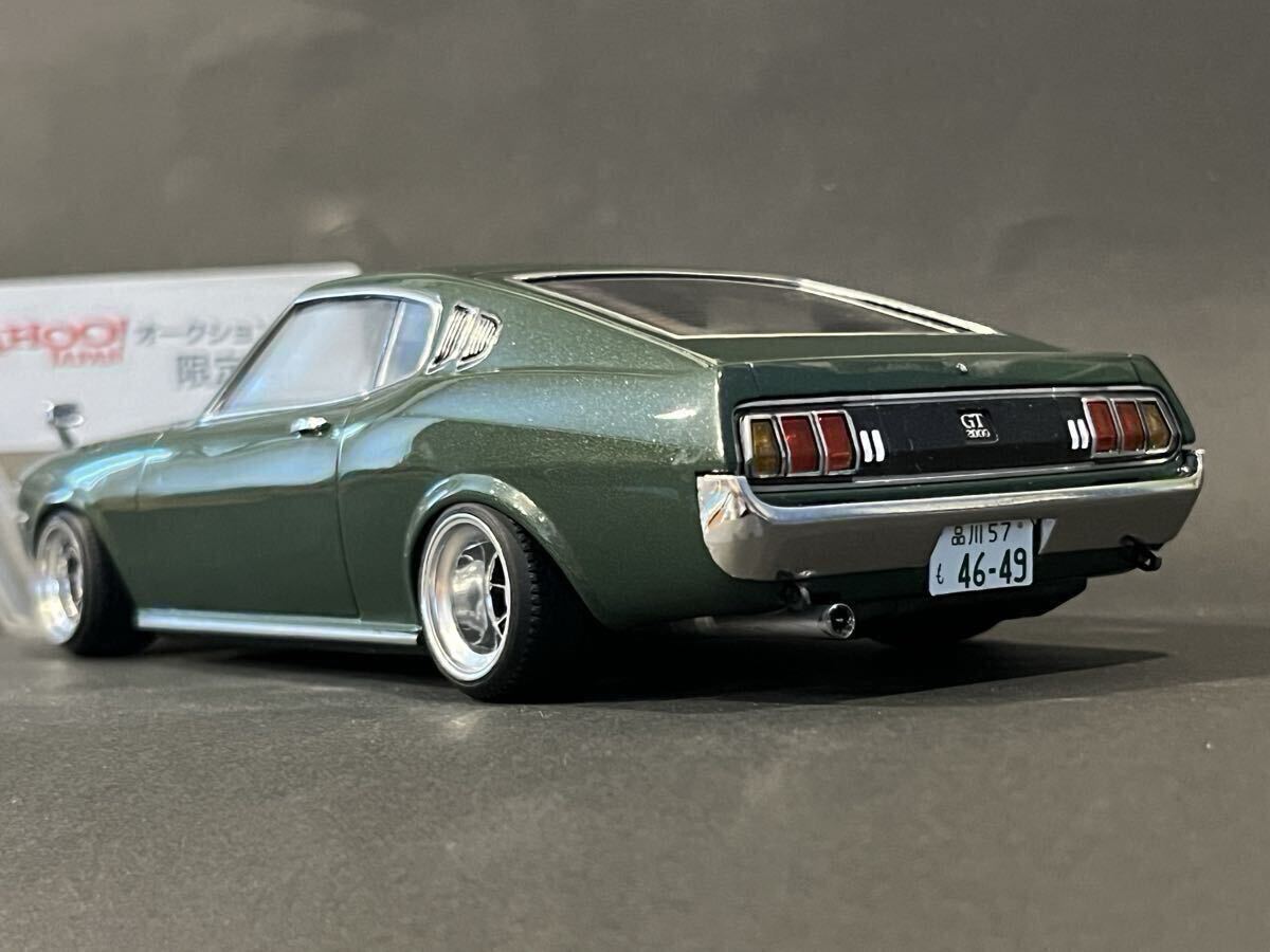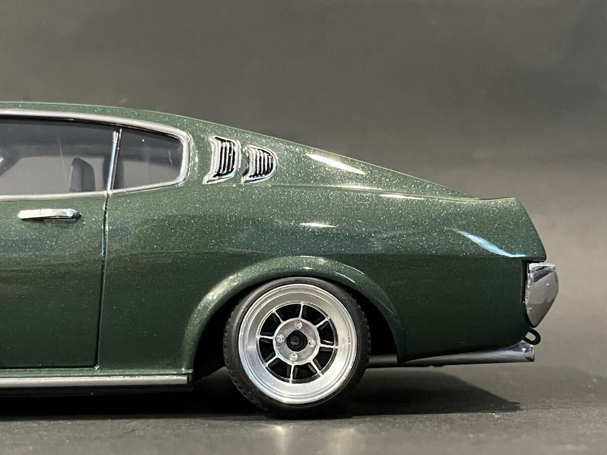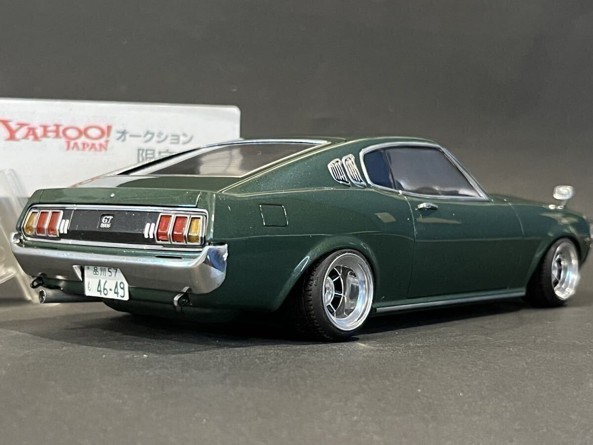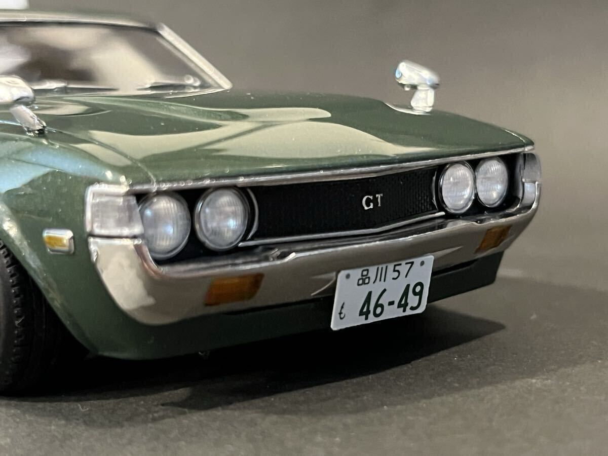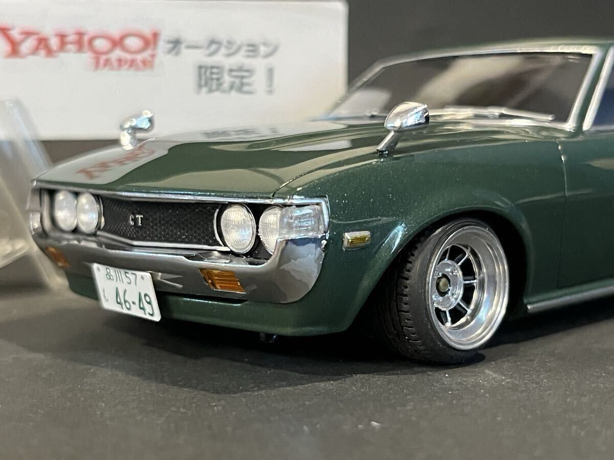 ご覧いただきましてありがとうございます。アオシマ製セリカLBのプラモデル組立完成品を出品いたします。写真にはありませんが飾台付きです(ダイソーコレクションBOX)。不要になりましたので出品致します。ボディは下地を整えてからグリーンメタに塗装してみました。クリアー塗装後、研ぎ出してからコンパウンドで仕上げてあります。外観の改造個所はサイドのモール、エンブレム類を取り外した状態にしています。フロントグリルですが、このキットはそのまま組むと暗い雰囲気になってしまいますので、ヘッドライトにリフレクターを仕込んで、ハセガワのダルマセリカのレンズでリアル感を増してみました。内装はセミグロスブラック一色に塗装してあり、コンソール、インパネなどの表現はしていません。ハンドルはキット付属のパーソナル?に交換しました。シートも運転席はバケットにしてあります。タイヤは同社のアドバンレイン風タイヤ。ホイルも同社のハヤシです。センターキャップを取り外した状態に加工して、テカテカのメッキを剥離してアルミホイルに見えるように塗装で表現してみました。タイヤは4輪とも固定でステアも回転もしません。シャーシ裏面は仕上げてありません。一部荒くカットしたり削ったりしてあります。マフラーは出口だけ直管風にしてあります。以上、ディスプレイ重視の完成品です。ムラ、キズ、磨き残し、ゴミ噛み、ボンド跡、などなど、粗がございますが、いかがでしょうか?商品はダイソーのコレクションBOXになるべく破損しにくいように梱包して発送致します。 万が一破損していた場合でも保障は出来ませんのでご理解できる方のみご入札願います。発送はヤマト運輸の宅急便EASY80サイズにて発送予定です。送料はご負担願います。 以上NCNRでお願いいたします。