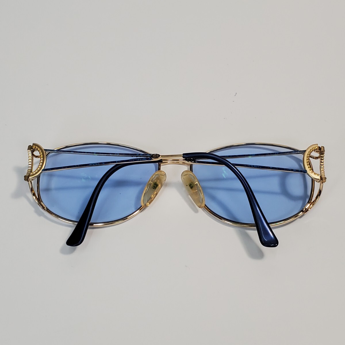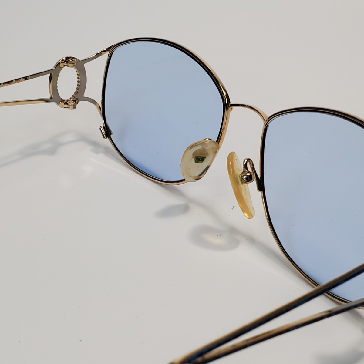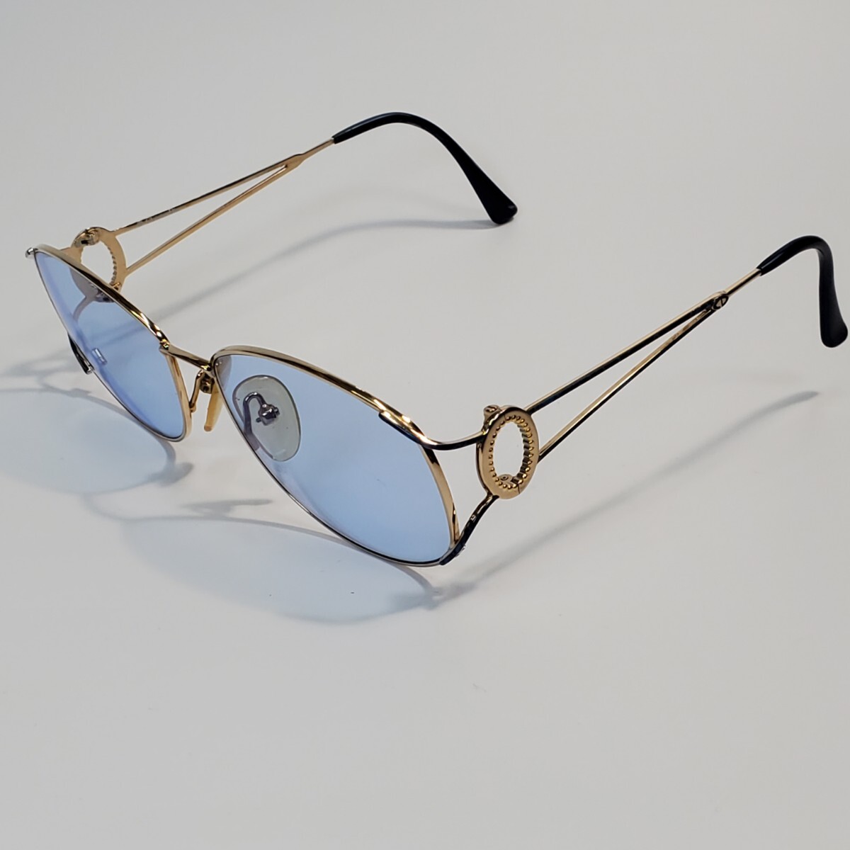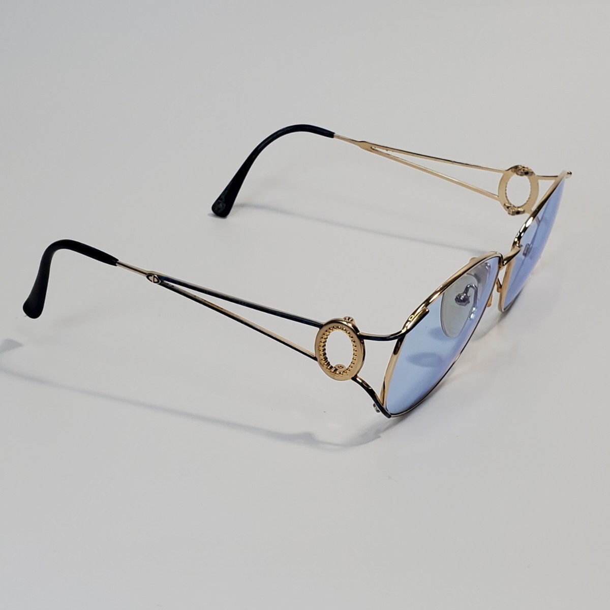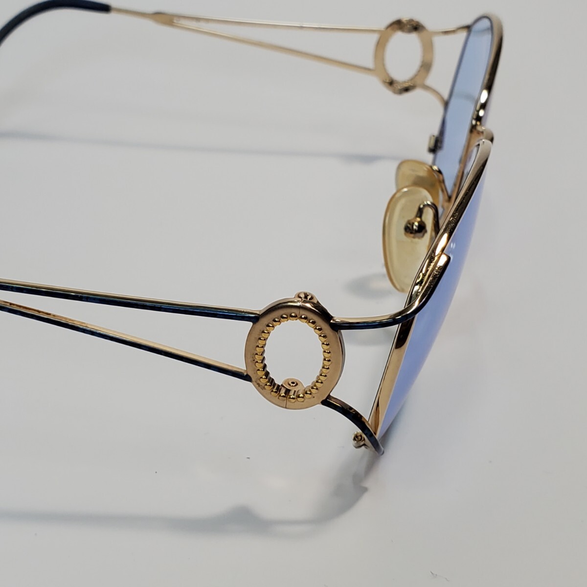 ゴールドフレームに淡いブルーレンズ、そしてサイドのリングモチーフが印象的な、ラグジュアリーな一本。