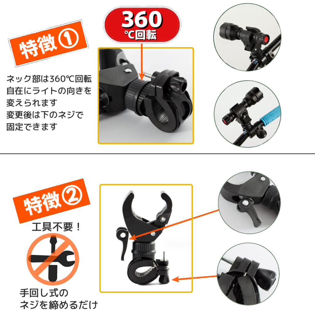 | 【商品について】 ■商品について 自転車のライトをハンドルバーに設置するためのマウント/ジョイント/アダプターです。 通常のスポーク位置よりライダー目線に近い位置にライトを設置できるため視認性が上がり事故防止につながります。 18mm~35mmの直径のグリップのあるライト、20mm-30mmの標準的なハンドルバーに対応しています。 付属のスペーサーを利用すると一部の細いハンドルバーのスポーツタイプの自転車にも設置可能です。 市場のほとんどの自転車にマウント可能です。 ネック部分は360度回転させることができます。 手回し式のため工具不要で設置できます。 ライトは付属しません。 ■商品詳細 商品内容:本体のみ 包装:OPP袋 素材:PP、スチール等 サイズ:50mm * 45mm * 43mm (約) 重量:110g (約) ■発送方法 定形外で発送します。お安くご提供するため簡易梱包となります。 ■本商品を使用した際に発生したトラブル、事故につきまして、当方は一切の責任を負い かねます。 ■傷や汚れなど実用上問題ない理由での返品はご遠慮ください。 ■こちらは海外直輸入製品となります。海外輸入のため神経質の人、詳しいサポートが必要な方はご遠慮ください。 後付け ブラケット アダプター |
