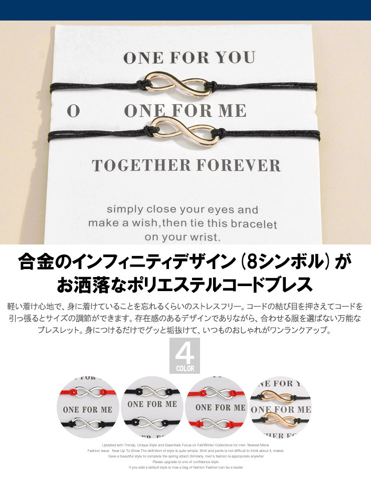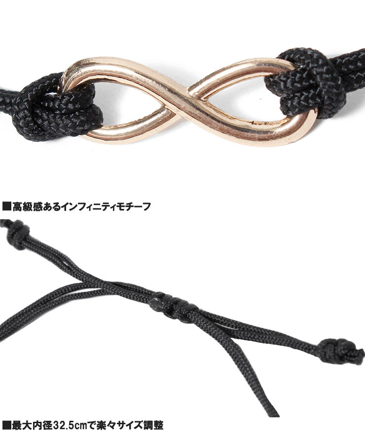 商品説明 | 合金のインフィニティデザイン(8シンボル)がお洒落なポリエステルコードブレス。 |