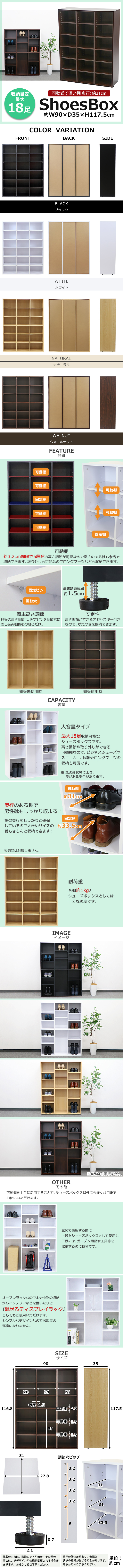 | 商品紹介 | ■最大18足の靴が収納できるシューズボックスです。 ■棚は高さ調節や取り外しができる可動式なのでビジネスシューズから長靴、ロングブーツまで収納できます。 ■棚の高さ調節は3.2cm間隔で5段階の調節が可能です。 ■奥行は約35cmとスリムなので混雑しがちな玄関に最適です。 ■可動棚を上手に活用することでシューズボックス以外にも様々な用途でお使いいただけます。 ■オープンラックなので『魅せるディスプレイラック』としてもご使用いただけます。 ※こちらの商品は組立て式です。 (組立てには、プラスドライバーが必要です。工具はお客様でご用意下さい。) ■重量:約39kg ■耐荷重:各棚約1kg ■可動棚高さ調節ピッチ:約3.2cm(5段階調節) ■材質:パーティクルボード(本体)、メラミン化粧板(本体)、ゴム(アジャスター) ■組立説明書付き ●カラーはウォールナットとなります。 ●新品商品ではありますが、輸入商品の為、多少の擦り傷などがある場合がございますので、ご納得の上ご購入下さいませ。 ●ご購入後、お客様ご都合によるご返品、ご返金等は一切お受け致しておりません。 ●本商品を使用した際に発生したトラブル、事故につきまして、当社は一切の責任を負いません。ご使用に関しましては、全て自己責任にてお願い致します。 |