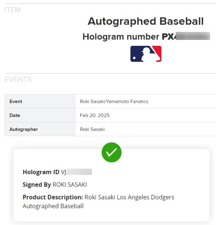 サインは、2025年2月20日にMLB機構立会いのもと、佐々木朗希投手と独占メモラビリア契約を結んでいる世界大手メモラビリア会社FANATICS社のサイン会でされたものです。サインを証明するFANATICS社とMLB機構のホログラムが貼ってあります。