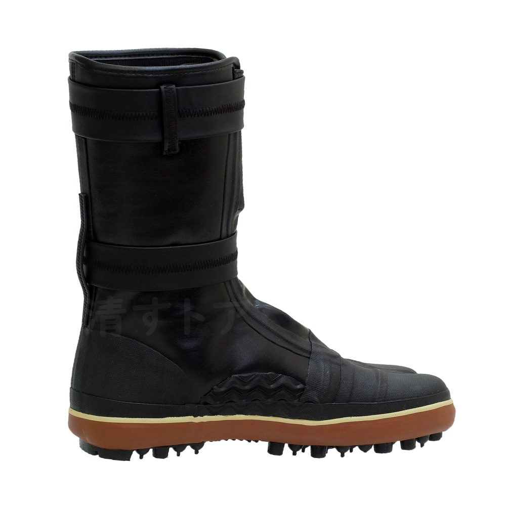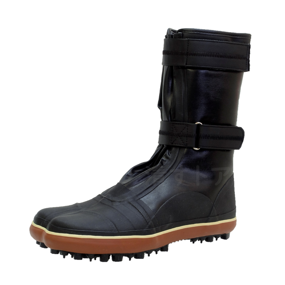 ◇安全完全防水スパイクシューズ。上段バンド下までの防水機能を有し、20cmほどの水深まで水の侵入を防ぎます。