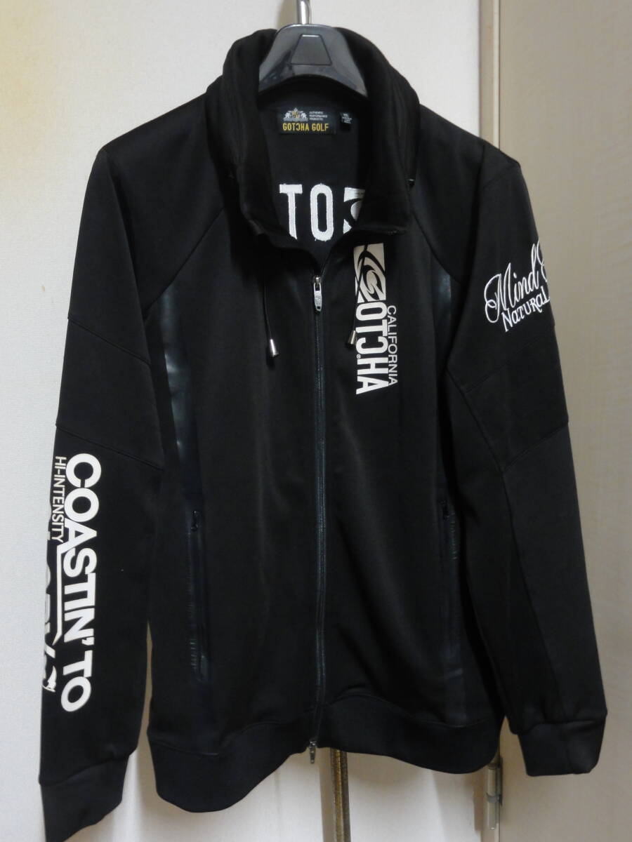 格安特大(XL・胸囲116cm位)・GOTCHA GOLF(ガッチャ)・黒系地・全面(両面+両袖)刺繍&プリント入り・収納フード付きトラックジャケット系ブルゾンになります。