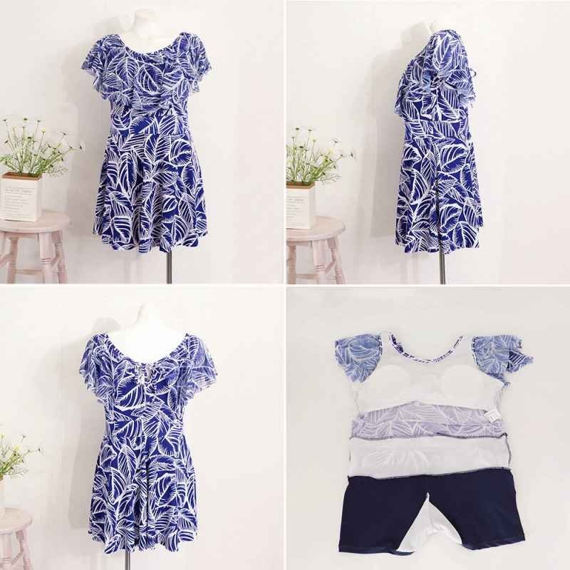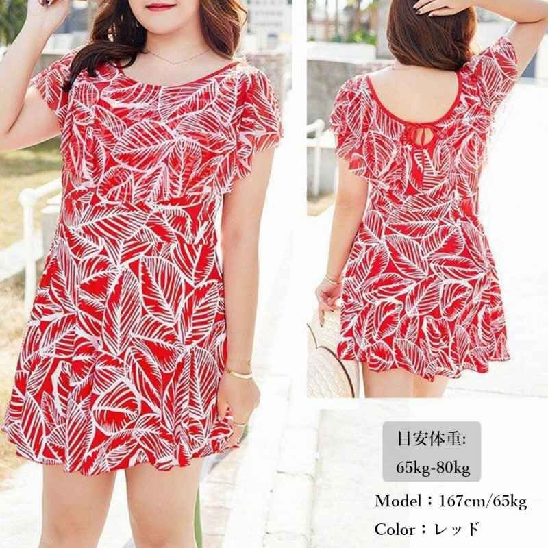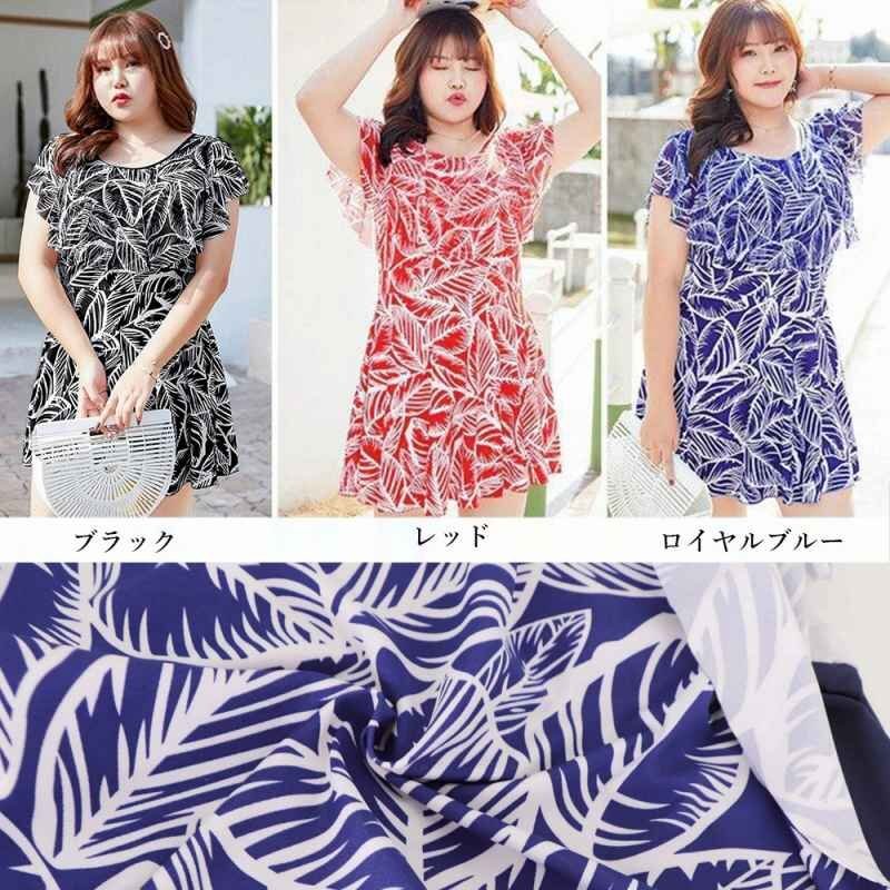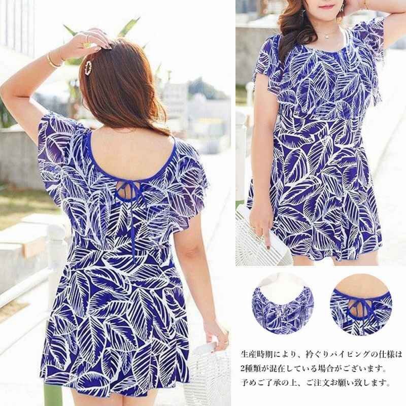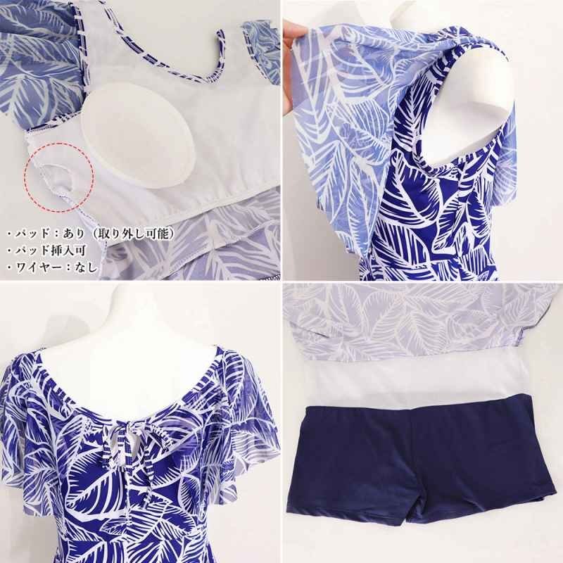 自然を感じさせる爽やかな印象の葉柄ショートパンツ一体型のワンピース水着です。