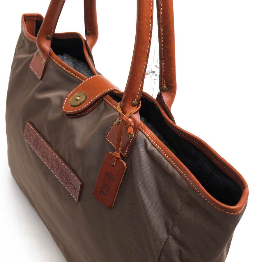 | 定番のリモンタナイロンを使用し、A4サイズが収納可能なショッピングトート。中身が多くない時はバッグのサイド部分を折り込み、巾着のようなシルエットにもできるのが特徴的。底がレザー加工で、中央のスナップボタンを外せば間口が広がり、書類の出し入れもしやすくお仕事などでも活躍します。手持ち、肩掛け可能です。 |