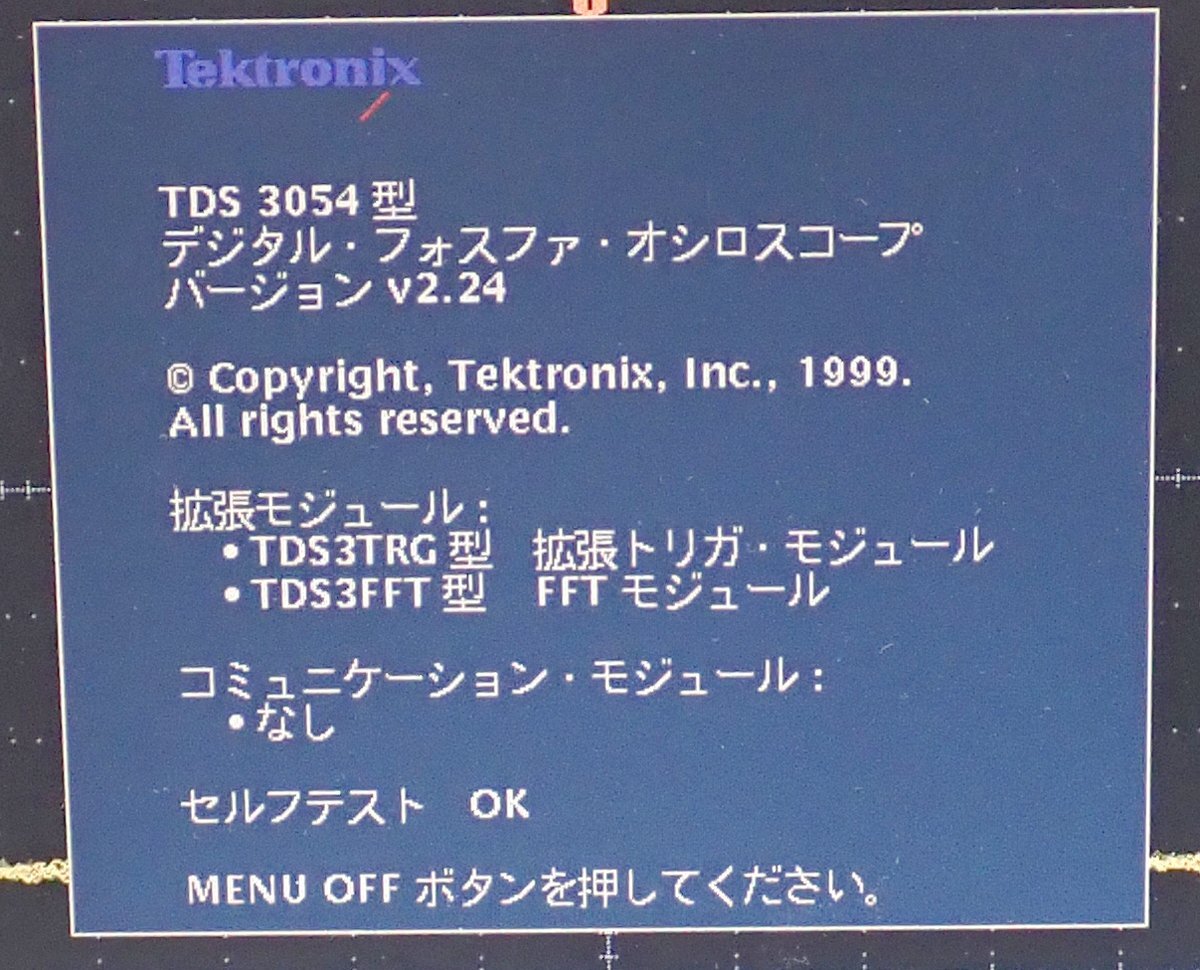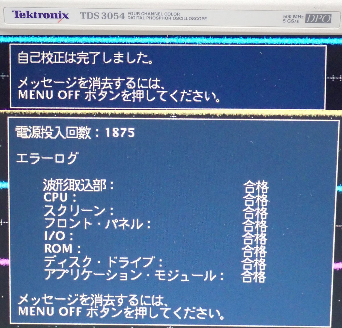 ■通電・起動の確認。 ※電源スイッチが破損しており、スイッチでのON/OFFができません。電源コードの抜き差しでON/OFFする形となります。 ■自己校正完了しました。 ■セルフテスト合格しました。 ■CH1~CH4にCAL信号を入力し測定確認を行いました。 ※精度を保証するものではありません。 ■当店では、上記以外の動作確認は行っておりません。 | ||||||||