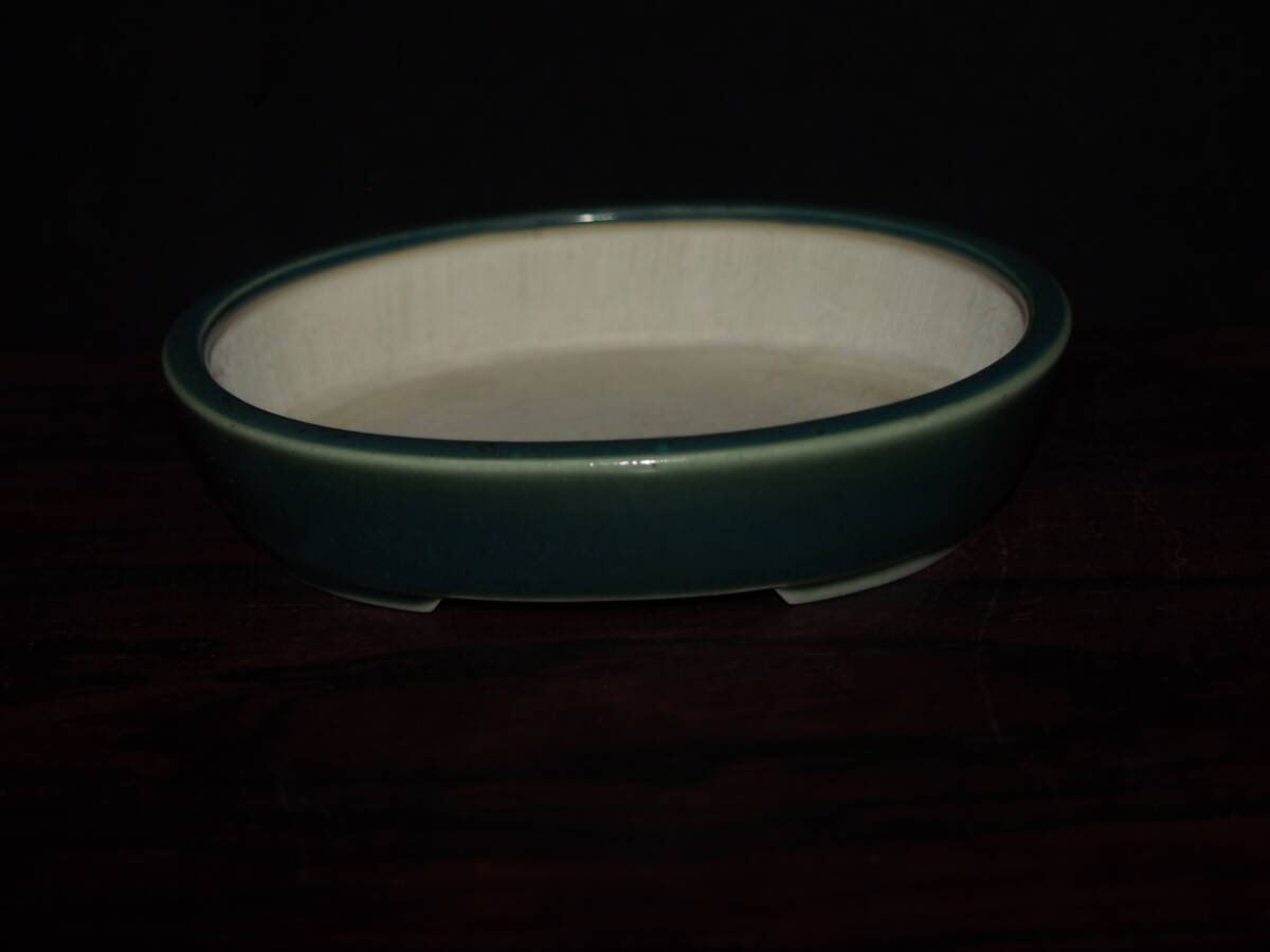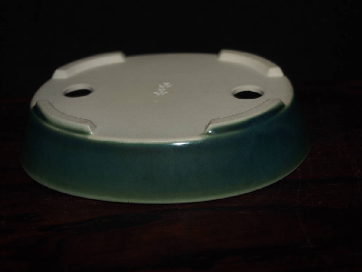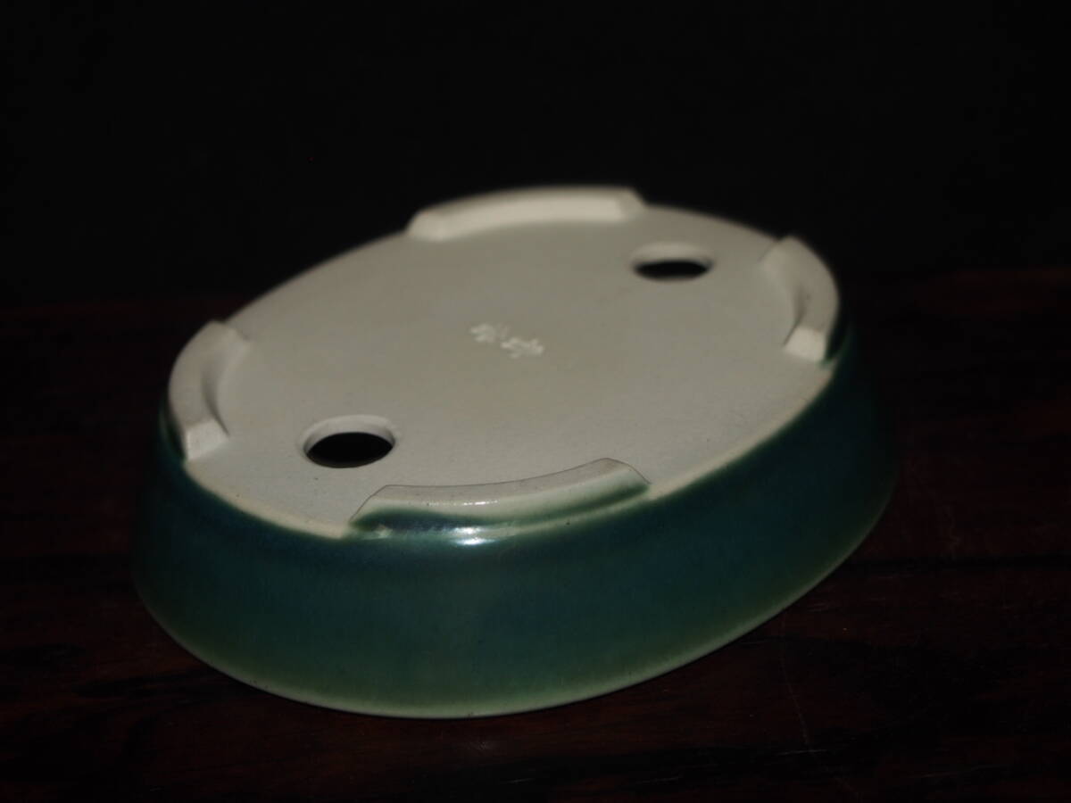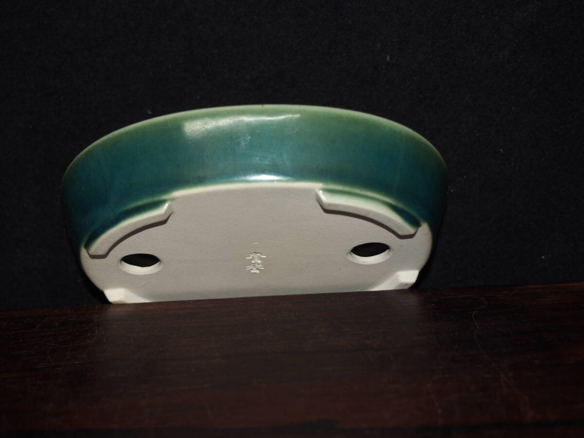 『大和魂』【春田青香①】緑釉窯変反縁氷裂切脚楕円鉢・巾11.8cm・人気物故作家 | ||