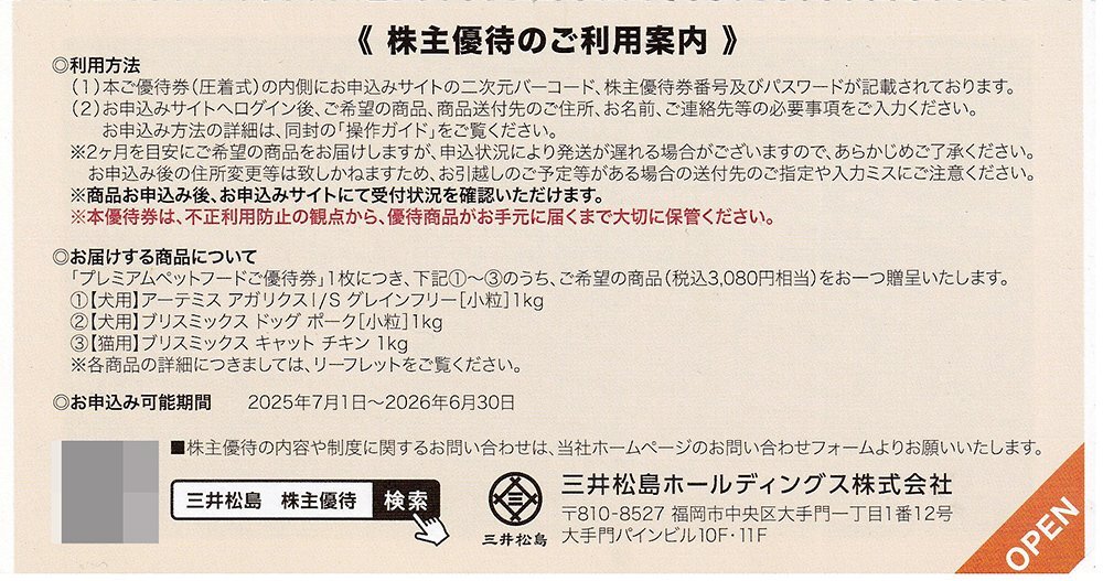 出 品 商 品 | 三井松島ホールディングス株式会社 株主優待 プレミアムペットフードご優待券 1枚 |