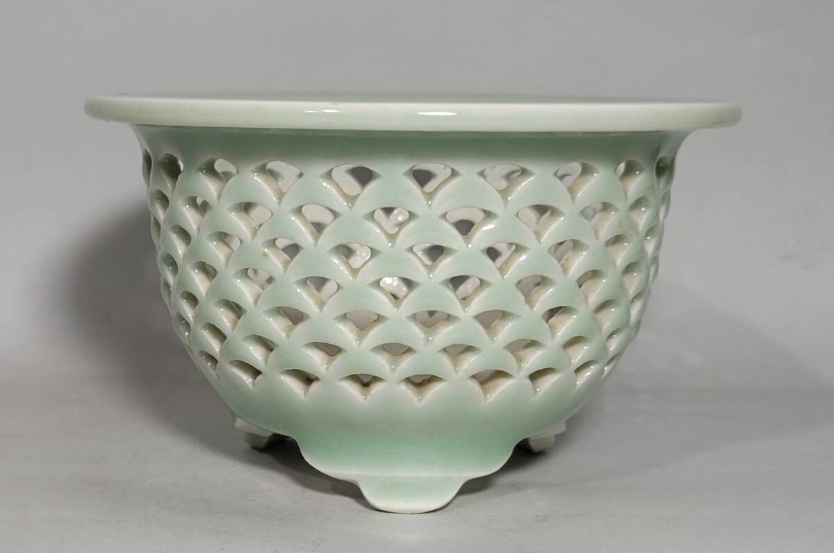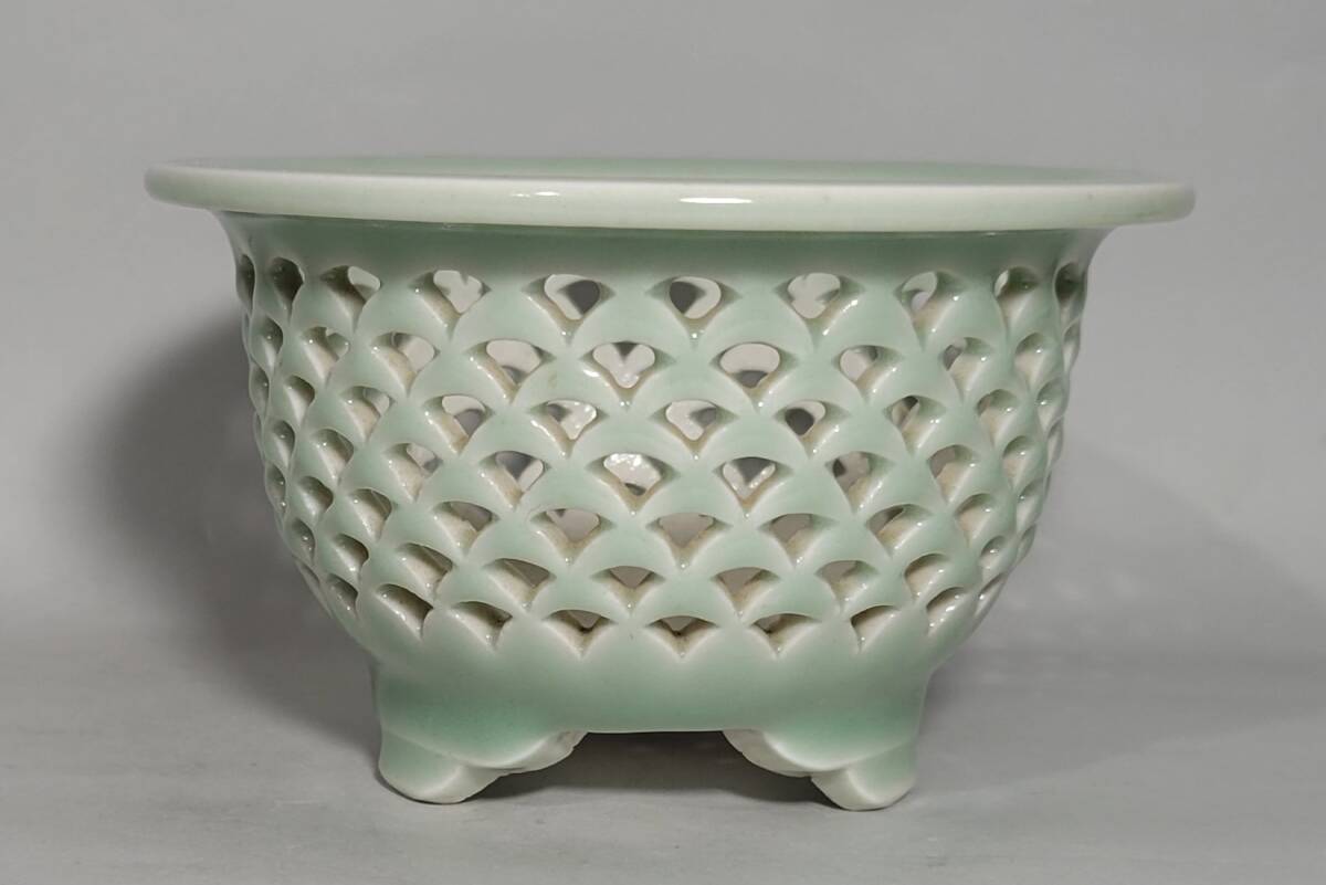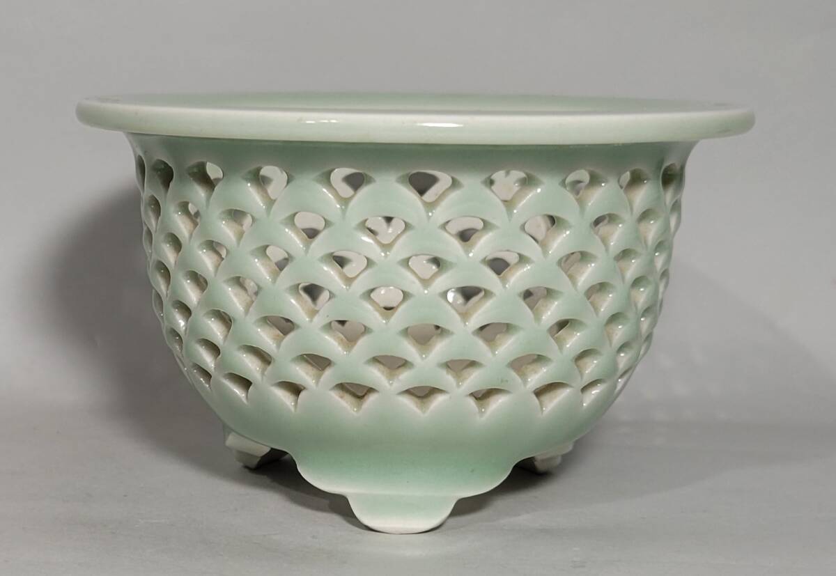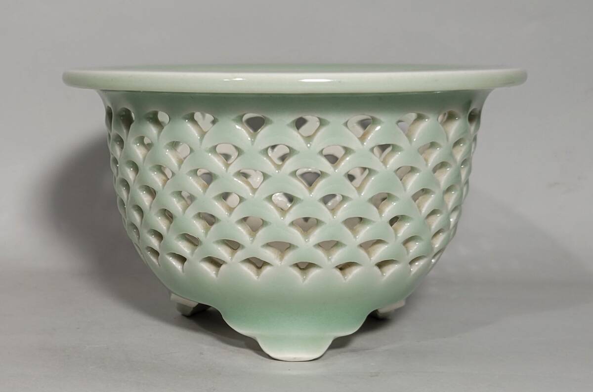 出品物 欅窯 三橋俊治作「青磁青海波透鉢」富貴蘭 風蘭 洋ラン 植木鉢 盆栽鉢 未使用品