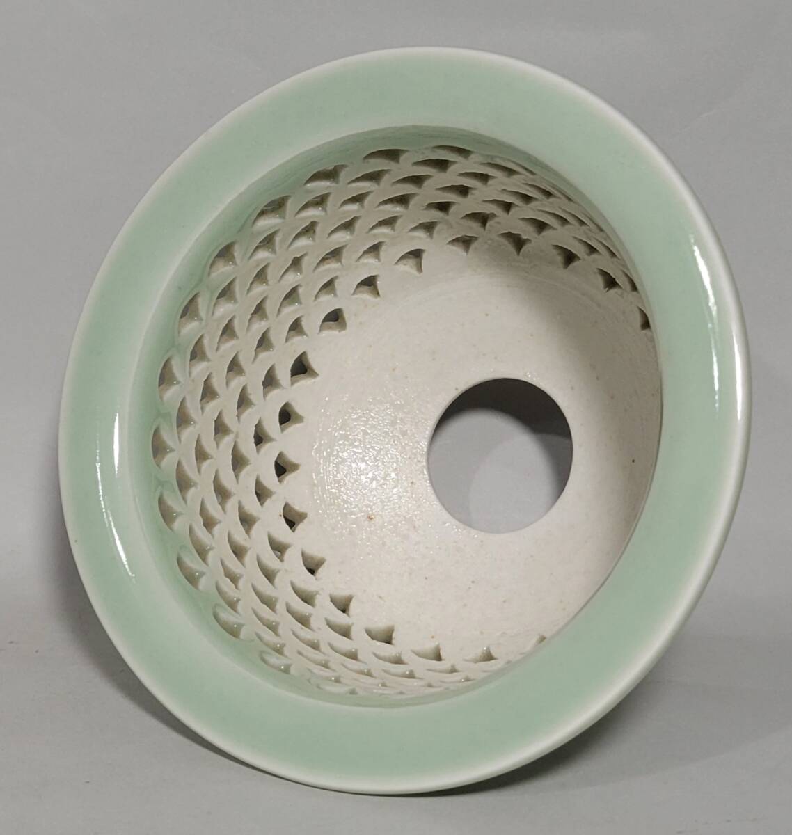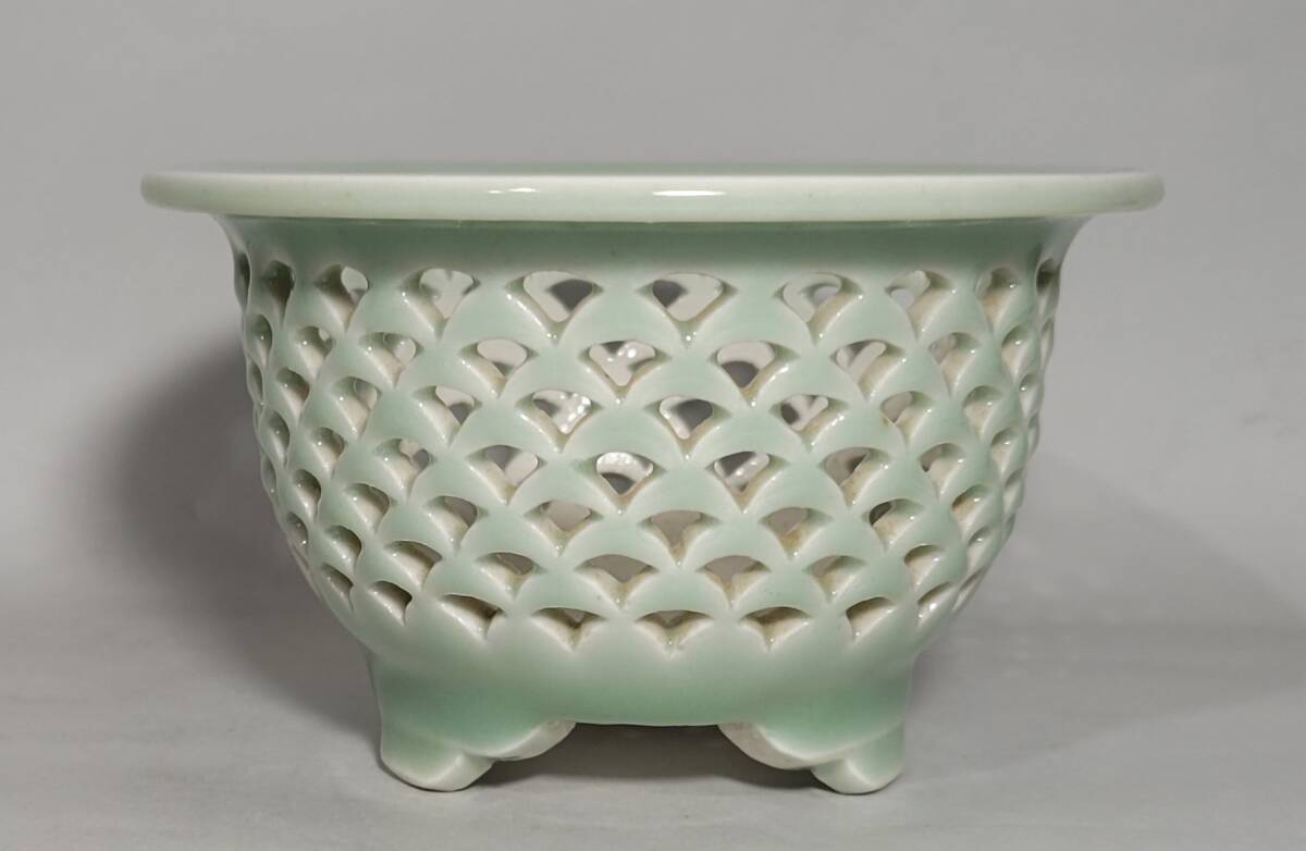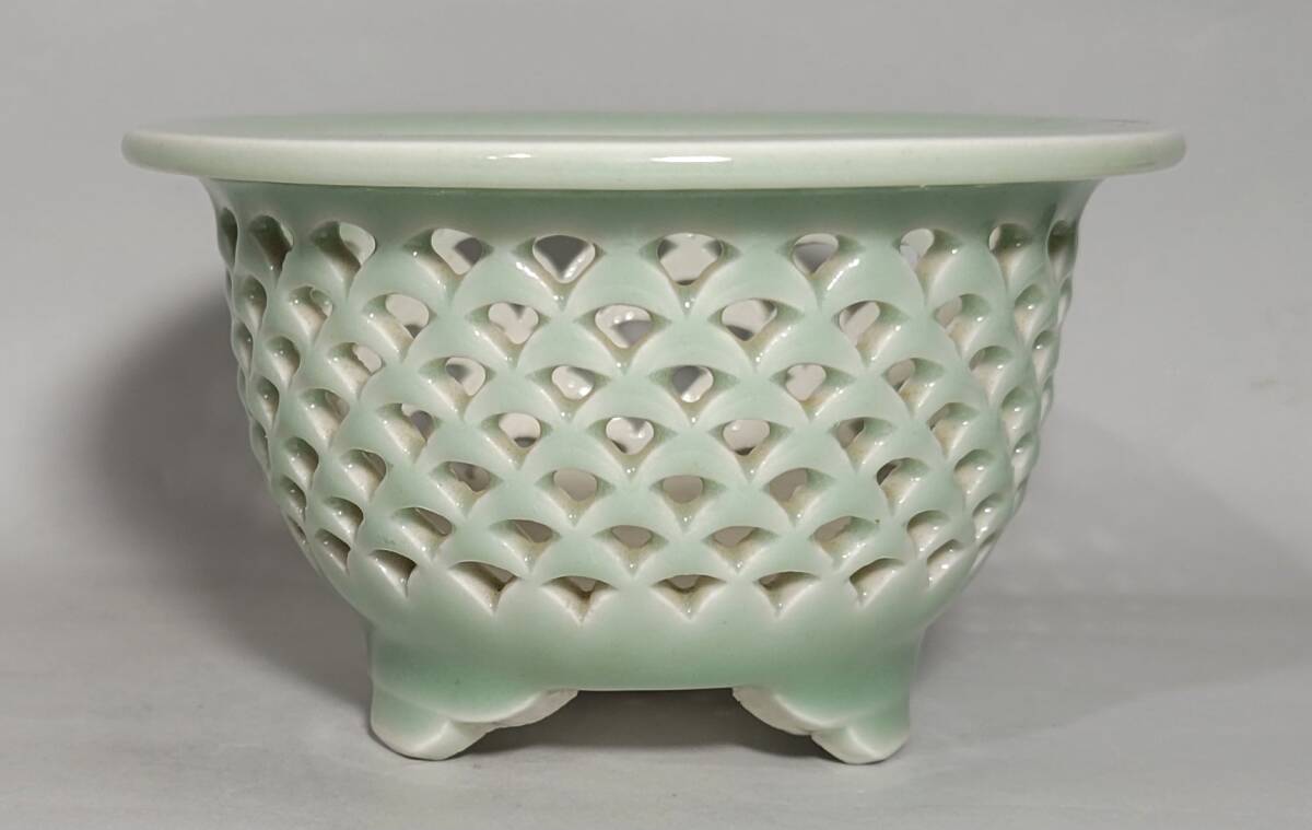 出品物 欅窯 三橋俊治作「青磁青海波透鉢」富貴蘭 風蘭 洋ラン 植木鉢 盆栽鉢 未使用品