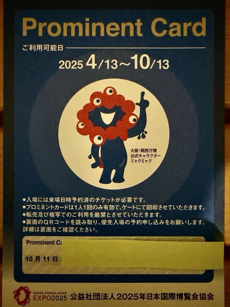万博会場の「東ゲート」「西ゲート」どちらでも使えるプロミネントカード(万博優先入場カード)です。