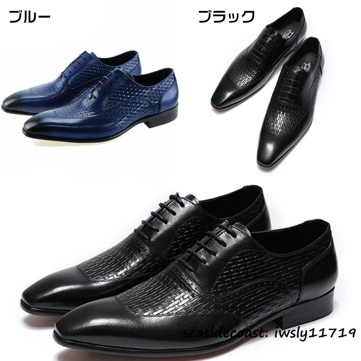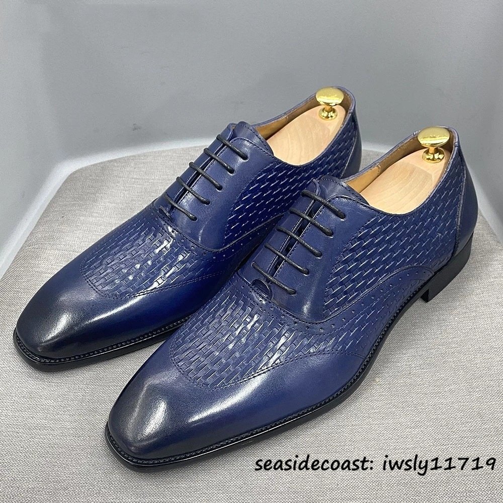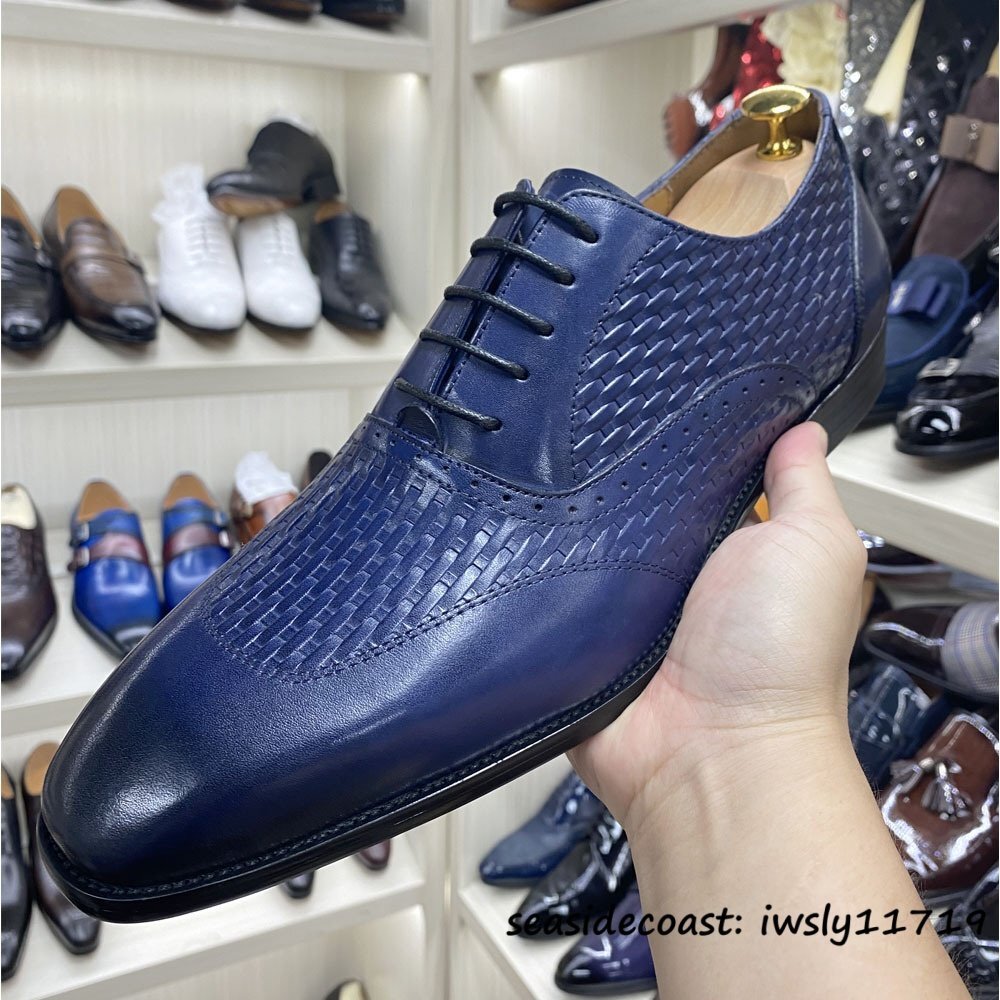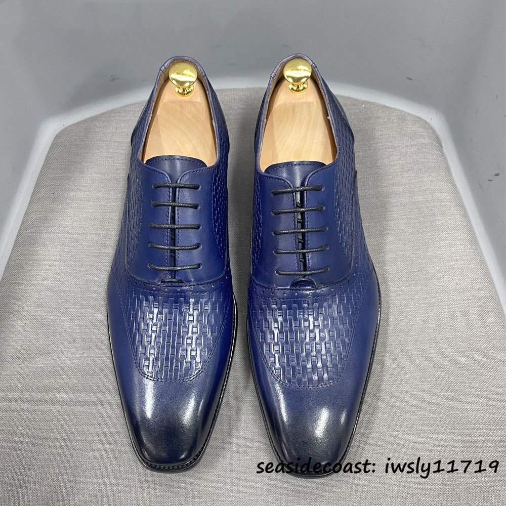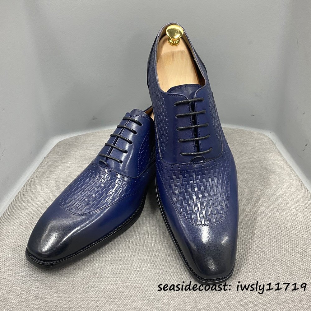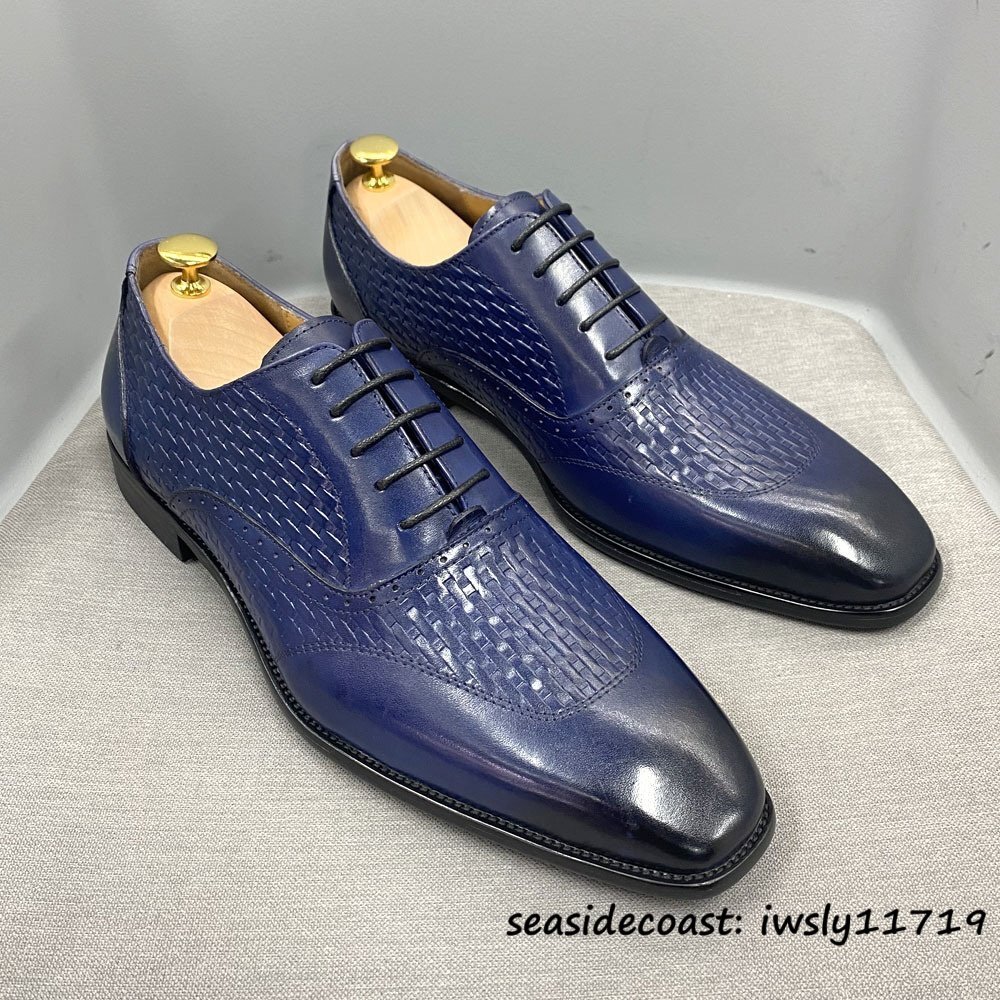 超希少★高級牛革 新品 ビジネスシューズ 編み込み 職人手塗り上げ メンズ レザーシューズ 本革 革靴 紳士靴 フォーマル ブルー 25.0cm
