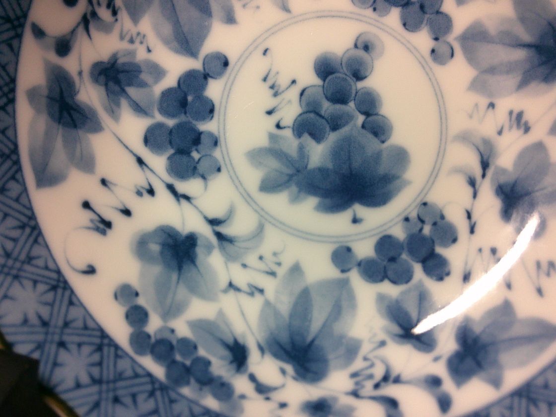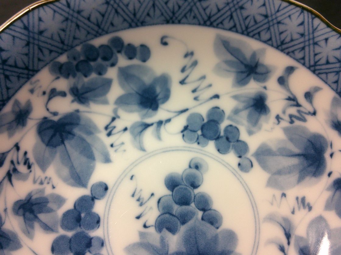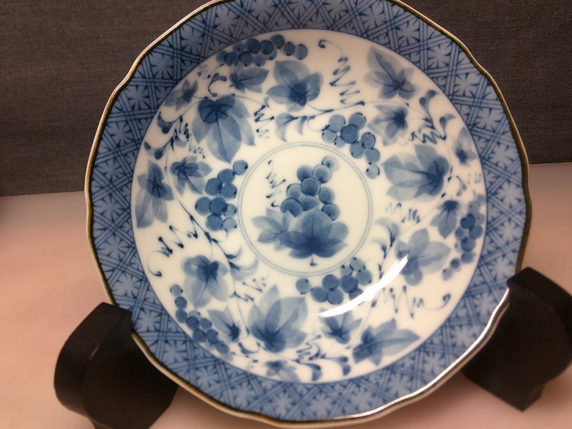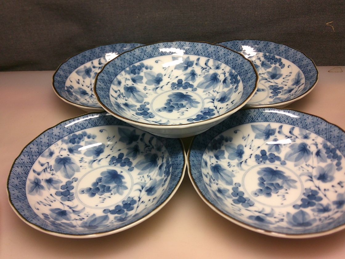 ◆美濃焼 聖窯 染付・葡萄絵・小皿5客・箱なし・サイズ幅13.5㌢奥行13.5㌢高さ3.5㌢◆762