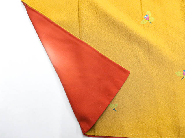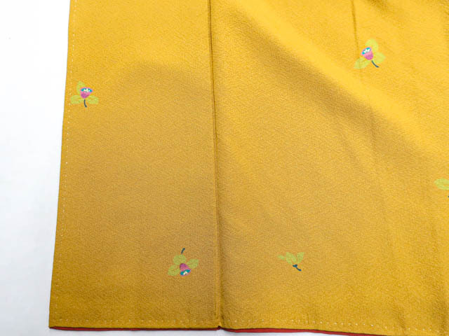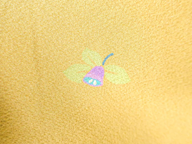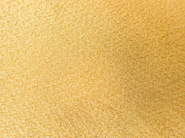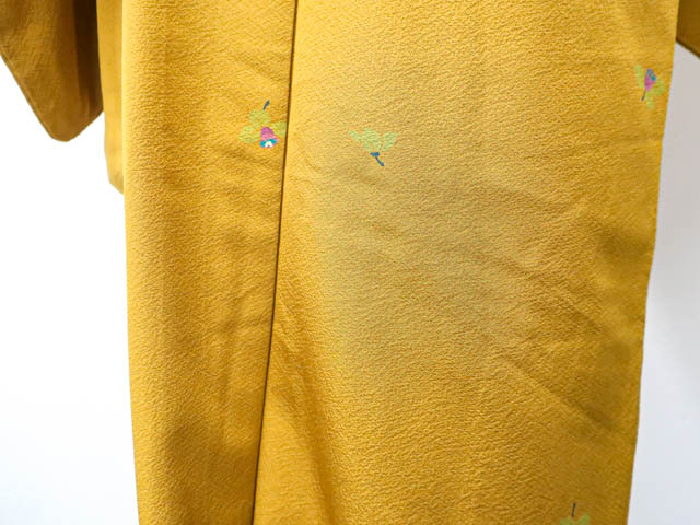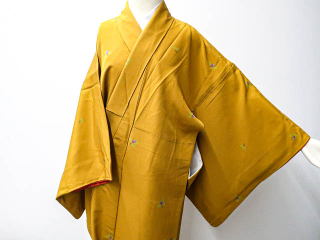 リサイクル商品のため、シワ、左袖にシミがございますが着用可能なお品です。 地色は、黄土色です。 1枚目の画像が近いお色かと思われます。 素材は正絹です。 |