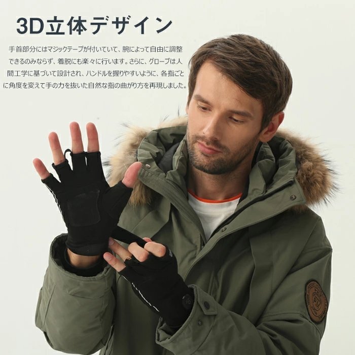 【3D立体デザイン】手首部分にはマジックテープが付いていて、腕によって自由に調整できるのみならず、着脱にも楽々に行います。さらに、グローブは人間工学に基づいて設計され、ハンドルを握りやすいように、各指ごとに角度を変えて手の力を抜いた自然な指の曲がり方を再現しました。