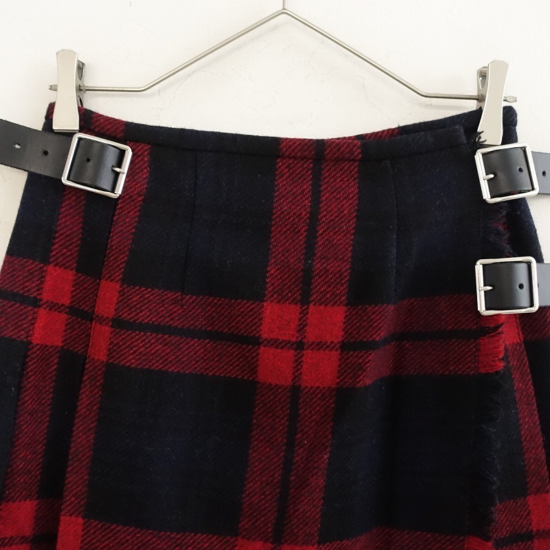 O’NEIL OF DUBLINのウール混チェックキルトスカートです。カラーはレッド・ブラック・ネイビーで、チェック織の微起毛地で仕立てられております。両腰のベルト留めのラップデザインでサイズ調整可能になっております。サイドからバックにかけてプリーツ入りで、フロント縁はフリンジになっております。別途シルバーのピンが付属されております。 |