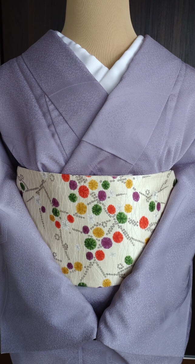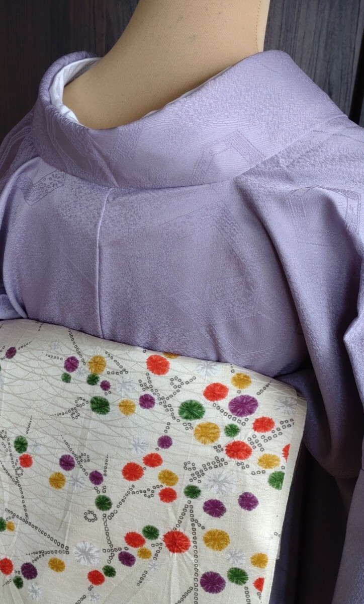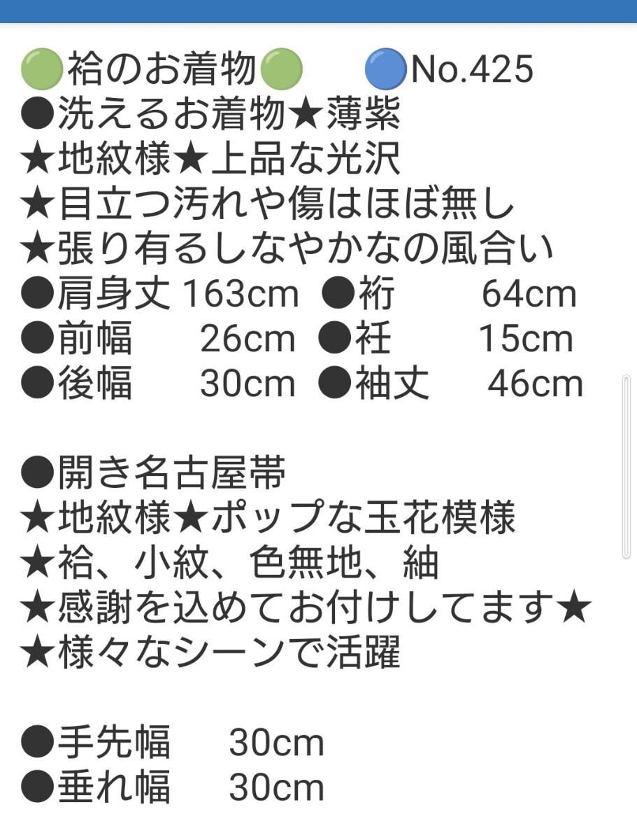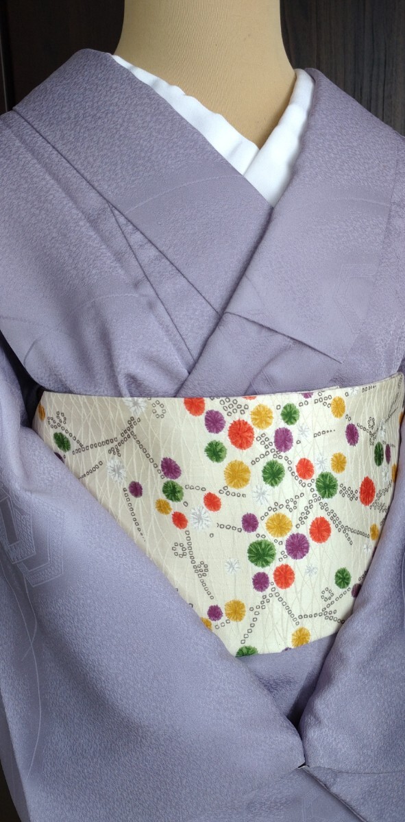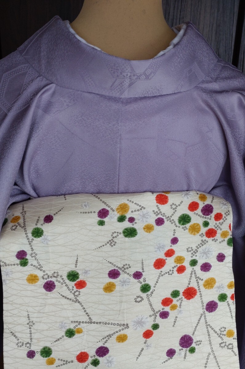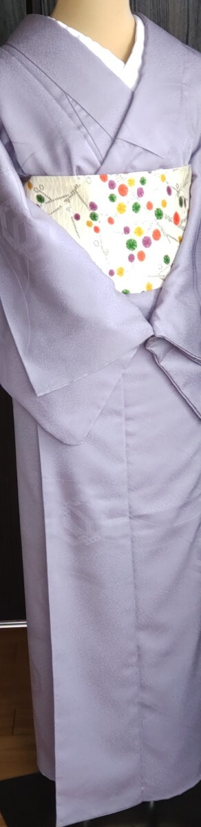 ●●夜桜●●袷お着物●洗えるお着物●地紋様★上品な薄紫★色無地●開き名古屋帯★ポップな玉花模様は感謝としてお付けしてます●No425