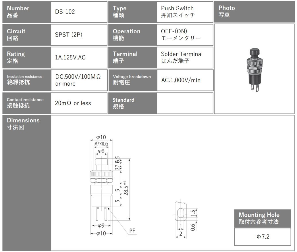 ミヤマ電器 DS-102 押しボタンスイッチ (モメンタリ) [2個組]【管理:SA2358】