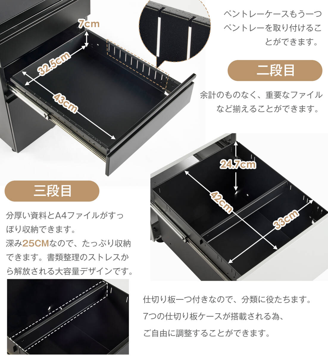 • 2. 【たっぷり収納できる!大満足の収納容量】用途によって使い分けできる3段の引き出し。まとめて、スッキリ。ファイル、文具、ノート、雑誌などをまとめて収納!細かく整理できるので取り出しやすいのが利点です。3段目は、A4ファイルがすっぼり納まります。着脱可能な仕切り板付きで、分類に役立ちます。効率よく整理できる同時に、充分な作業スペースも保証します。
