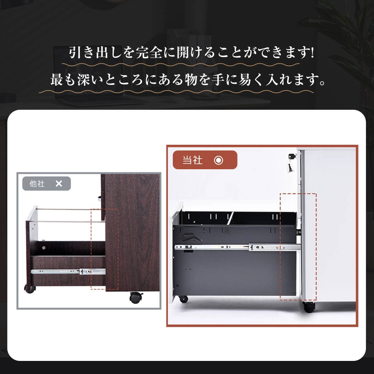 • 4.【前倒れ防止】引き出しには重くなると「ガタっ」と大きく傾くものがあります。しかし「フリーク」はキャスターを取り付けことで悩みを解消しました。