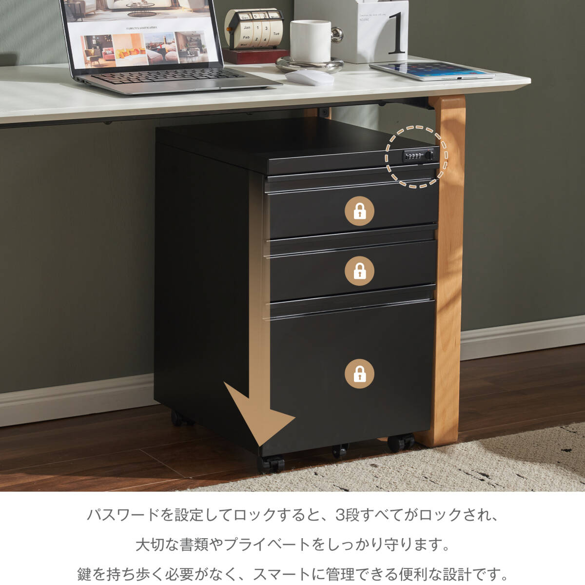 • 6.【3段オールロック】一箇所を施錠すれば、すべての引き出しがロックされるので、大切な書類やプライベートをしっかり守りし、セキュリティ面も安心です。