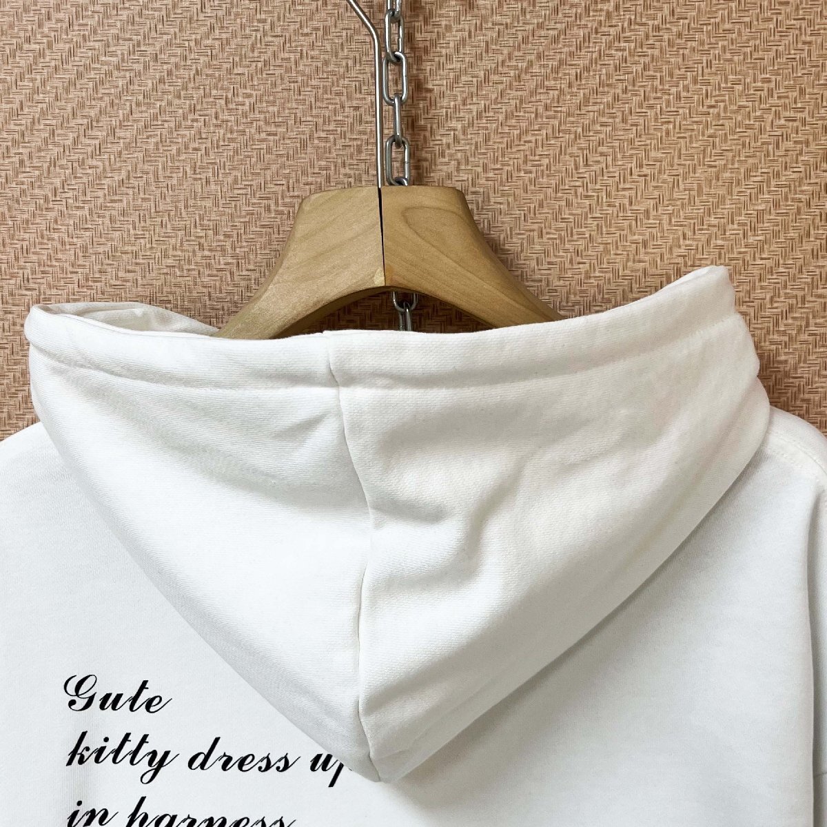 ベーシックなフード付きデザインで着脱しやすく、普段使いにぴったり。フロントには気品あふれるネコのプリントをあしらい、シックで個性的な雰囲気を演出。さらに英字柄を組み合わせることで、ファッション性もぐっとアップしています。