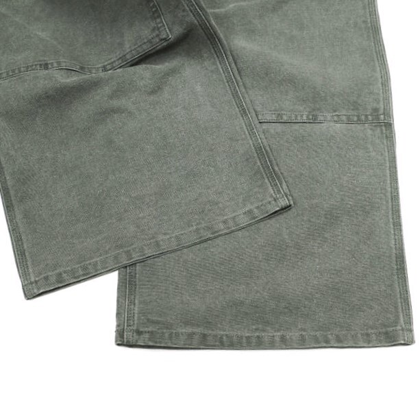 表情のあるムラ糸のコットンダックを用いて顔料染めし、ストーンバイオウォッシュの製品加工で白く退色させてアタリを出しています。