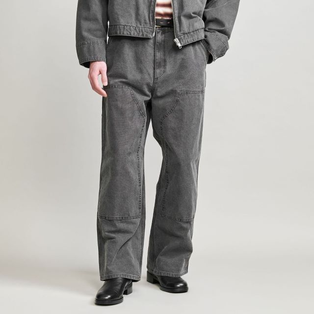 ワークパンツをベースに、都会的なムードでアレンジしたダブルニーパンツ。