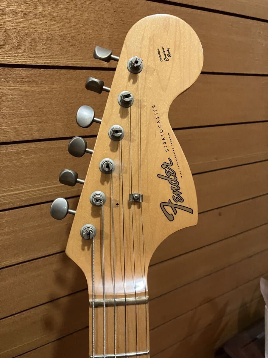 ご覧頂き有難う御座います、fenderジャパンST66です。ビンテージですとこの年からラージヘッドになりますね、細めのCシェイプ貼りメイプルネックにアルダーボディーです。ピックアップは純正、ポットはCTSのヘソ付きビンテージタイプx3、サークルDコンデンサー、スイッチクラフト製ジャック、USA製ゆネックプレート、CRL3点スイッチ、ブラスナット等まだまだ長い間弾いて頂けるギターです。塗装の劣化や金属部のくすみは有りますが美品だと思います。是非この機会に如何でしょうか?