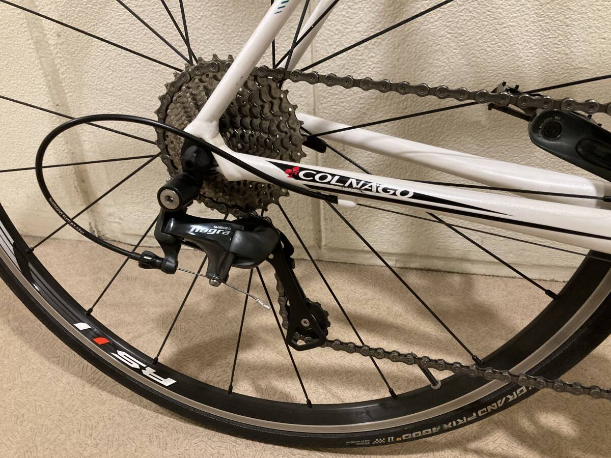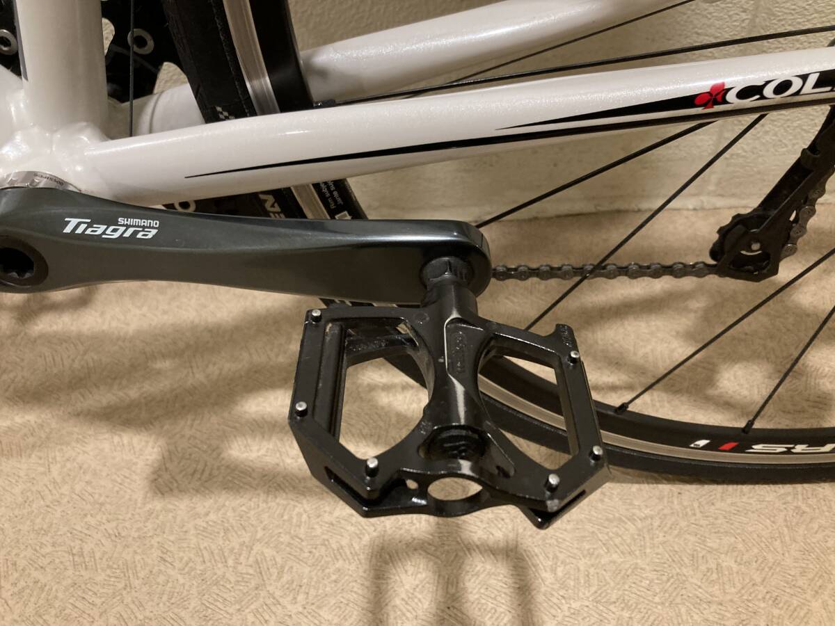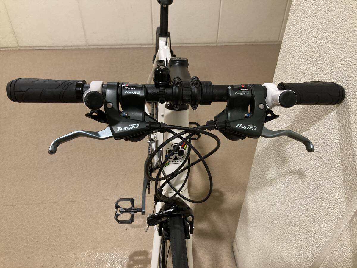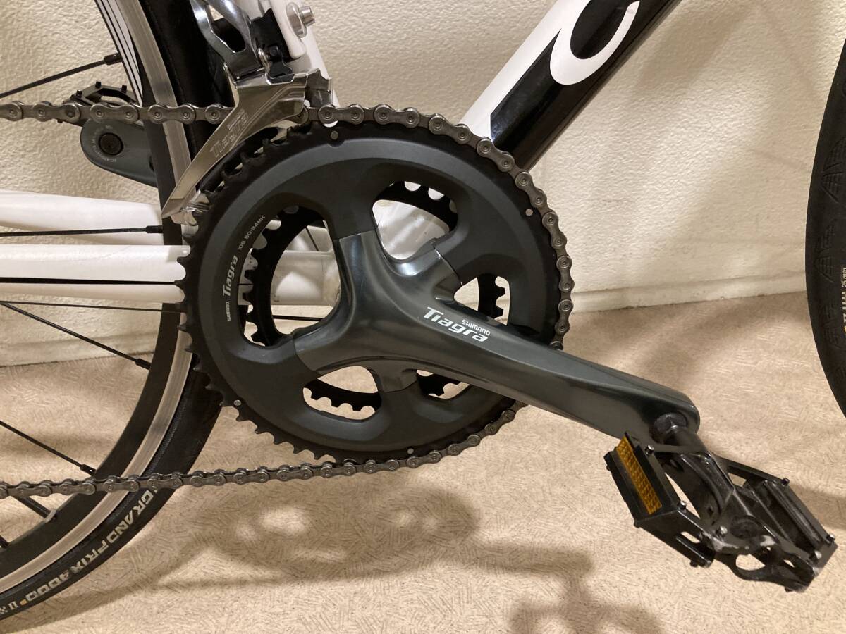 2018〜19年頃のモデルを横浜の割と有名な中古バイクショップで2021年にほぼ未使用な状態で購入しました。その際にサイクルコンピュータを付けて自分の走行距離は2300km程です。このモデルはシマノのSORAあるいはCLARISといったコンポが標準ですが、私が購入する時にはブレーキは105、他のパーツはほぼTIAGRAにグレードアップされていました。またホイールはシマノのRSへと変更されています。前のオーナーが凝った方で自分が乗る前に手を掛けましたが事情により泣く泣く手放すことになったと伺いました。購入後は室内駐輪場にて保管、雨天の走行はありません。1年に1回程度 近隣のサイクルショップでメンテナンスを行なっていました。使用に伴う小傷や使用感はありますが目立つ傷や走行に支障をきたすような不具合はなく、程度は良い状態かと思います。配送のノウハウがありませんので川崎市武蔵小杉近辺まで取りに来て下さる方にお願いします。ペダル付属しますので帰りに乗って帰れます。中古品ですのでノークレームノーリターンでお願いします。落札がありましたらタイミングにもよりますが防犯登録を抹消して引き渡しする予定です。休みが土日ですので引き渡しのタイミングは相談させてください。