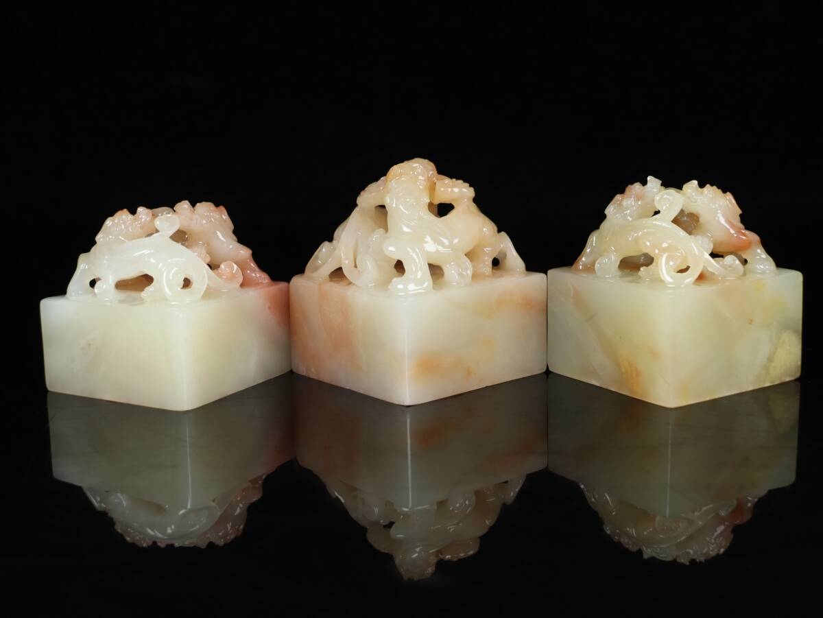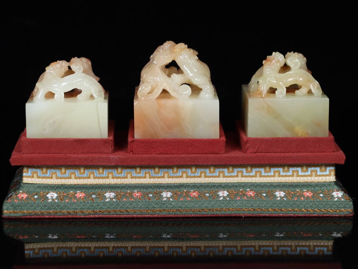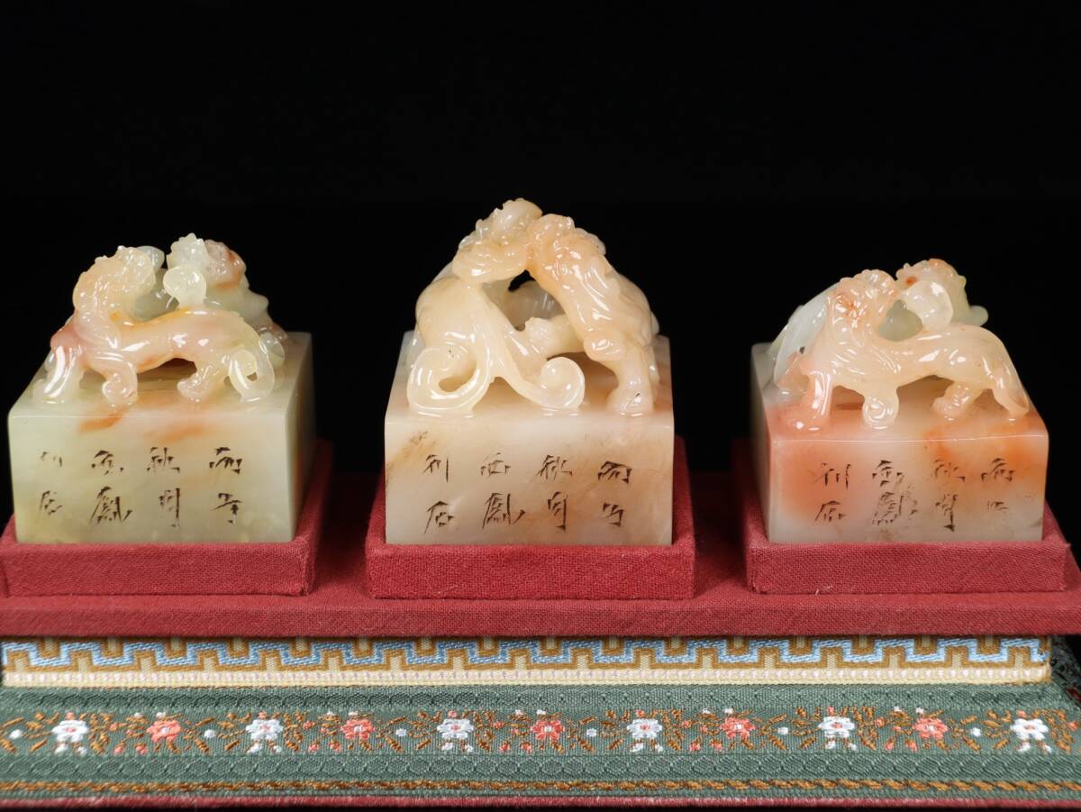 *珍品旧蔵* 【清代篆刻家 潘西鳳】寿山石 彫刻 瑞獣三件套章 天然石 手彫 篆刻 古印材 極細工 中国古玩 骨董品 古美味 H410