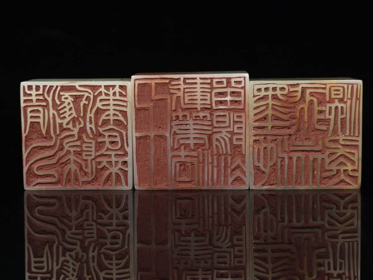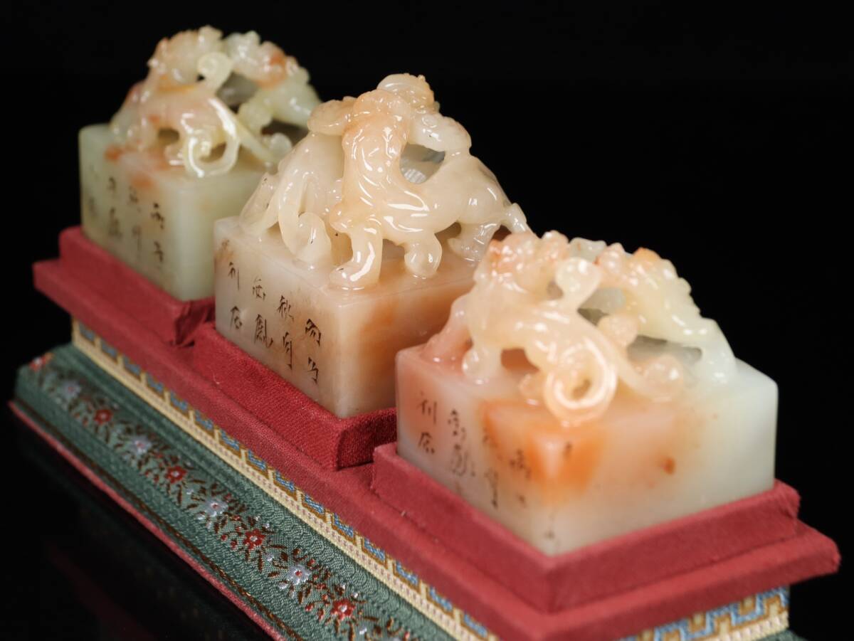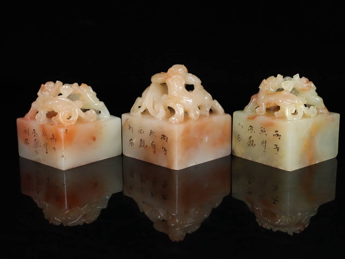 *珍品旧蔵* 【清代篆刻家 潘西鳳】寿山石 彫刻 瑞獣三件套章 天然石 手彫 篆刻 古印材 極細工 中国古玩 骨董品 古美味 H410