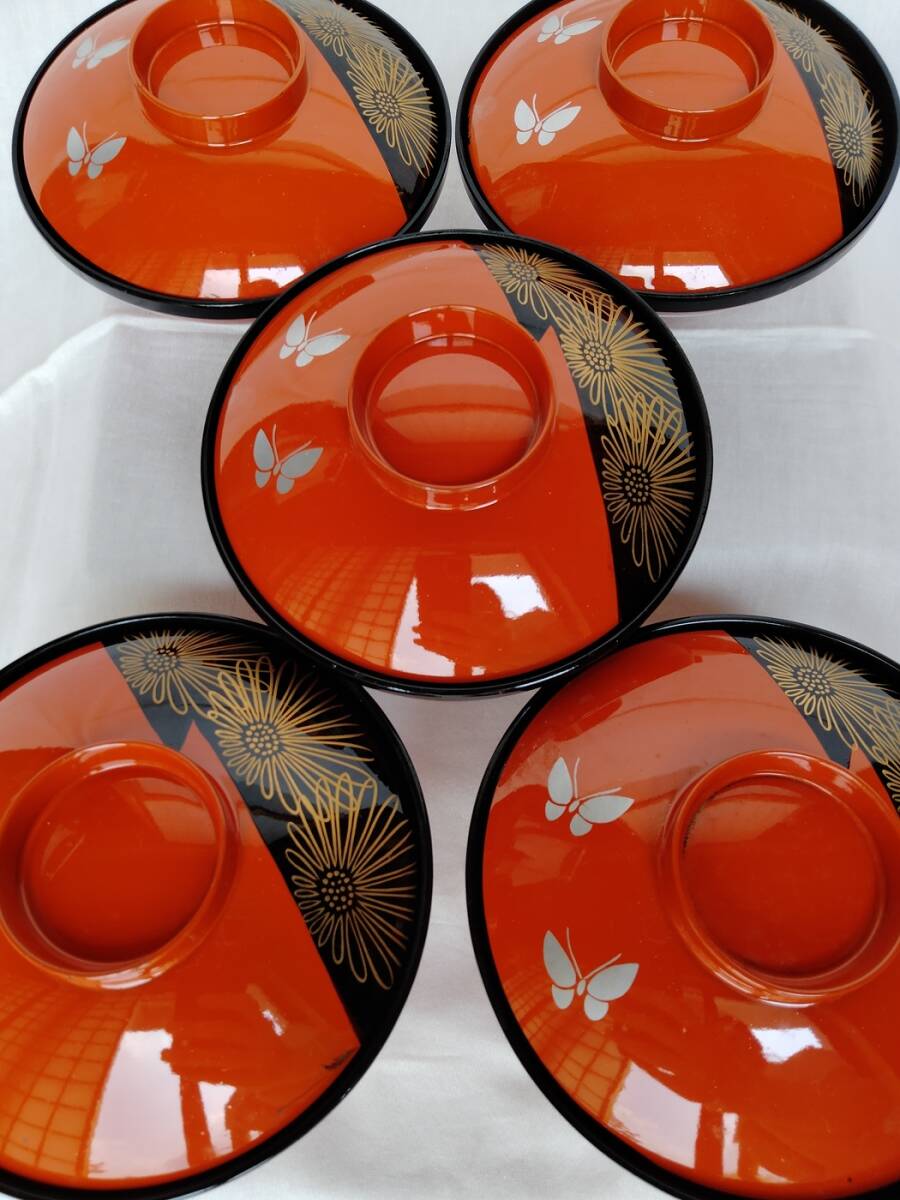 新品 未使用 汁椀 蓋付椀 漆器 吸物椀 雑煮 お椀 和食器 お椀 五客 蝶 花 菊