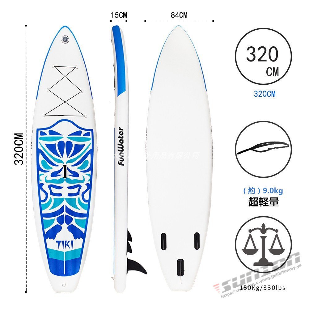【商品特徴】■サーフィンや水上散歩などが楽しめるスタンドアップパドルボードです。■層構造で機械のみの加工ではなく、丁寧に一台ずつ手作業で立体に加工された本格SUPボード。■SUPを楽しみながら体幹トレーニングできます。■空気を入れて使用するインフレータブル式です。■使用後は空気を抜けるので収納は非常にコンパクトです。■荷物はゴムのバンジーコードでしっかり固定できます。■ボードが沖に流されないようにリーシュコードが付いています。【商品内容】:パドルボード本体/パドル/空気入れ/リペアキット/リーシュコード【素 材】:ドロップステッチ+ラミネートPVC ダブルレイヤー+EVAバッド【サイズ】:(約)320cm×84cm×15cm【重量】:(約)9.0kg【積載重量】:(約)150kg【排水量】:(約)315L【最大空気圧】:15psi○使用上の注意事項○※改造/本来の目的以外/強い衝撃などはお控え下さい。※ 本製品を使用したことによる直接的&間接的に生じた事故、損害、破損についての責任は負いかねますので、ご注意ください。※こちらの商品は大型配送の為、返品対象外商品です。○以上を了承の上ご購入ください○