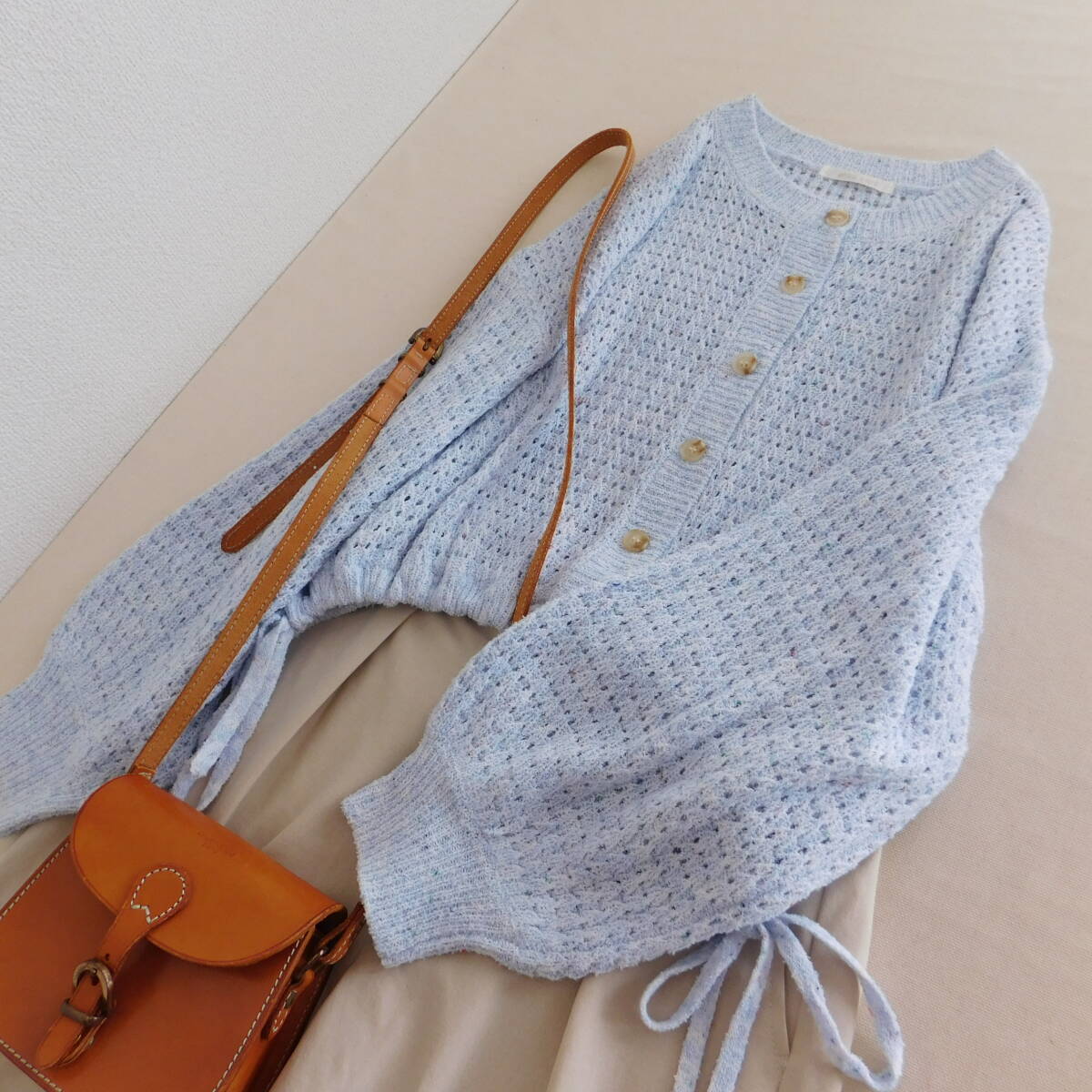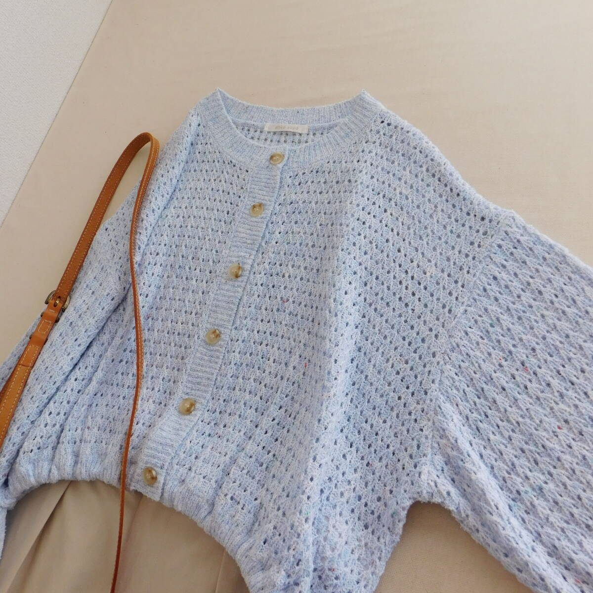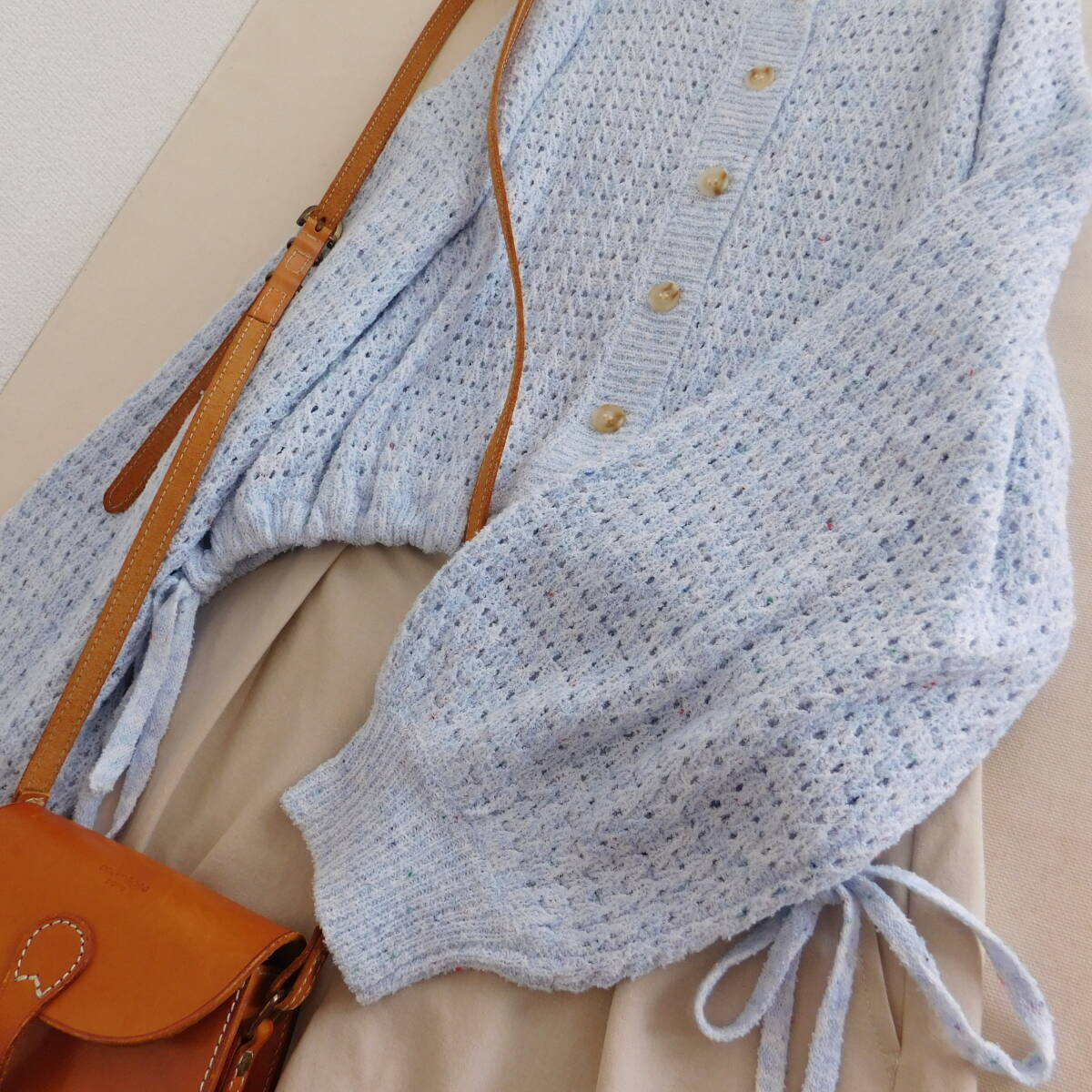 水色ミックスカラーのドロストカーディガンがかわいいです。