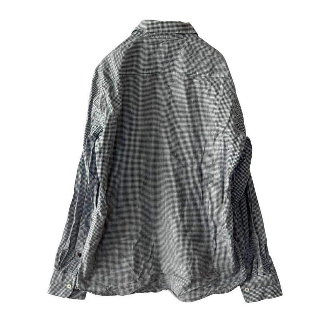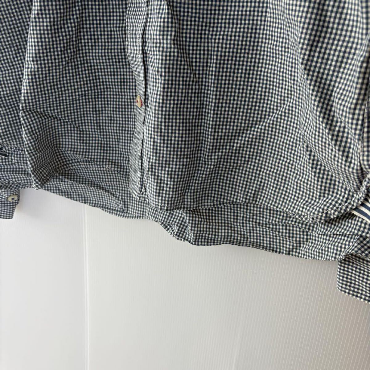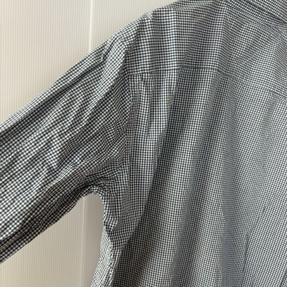 ブルー系のギンガムチェック柄、ボタンダウンカラーの長袖シャツ。