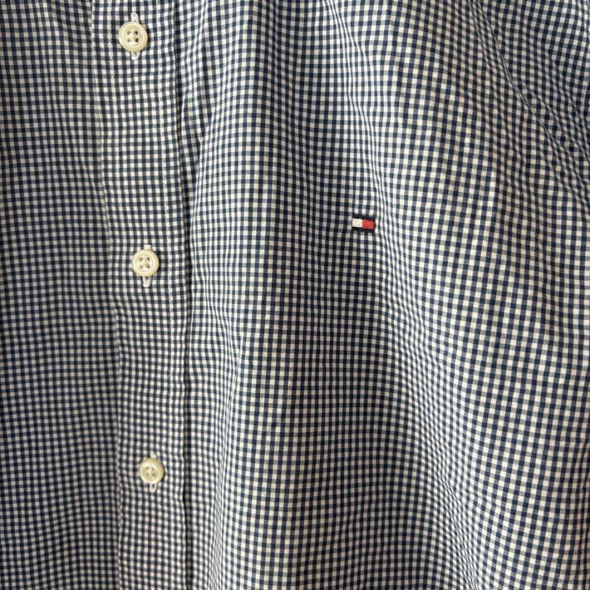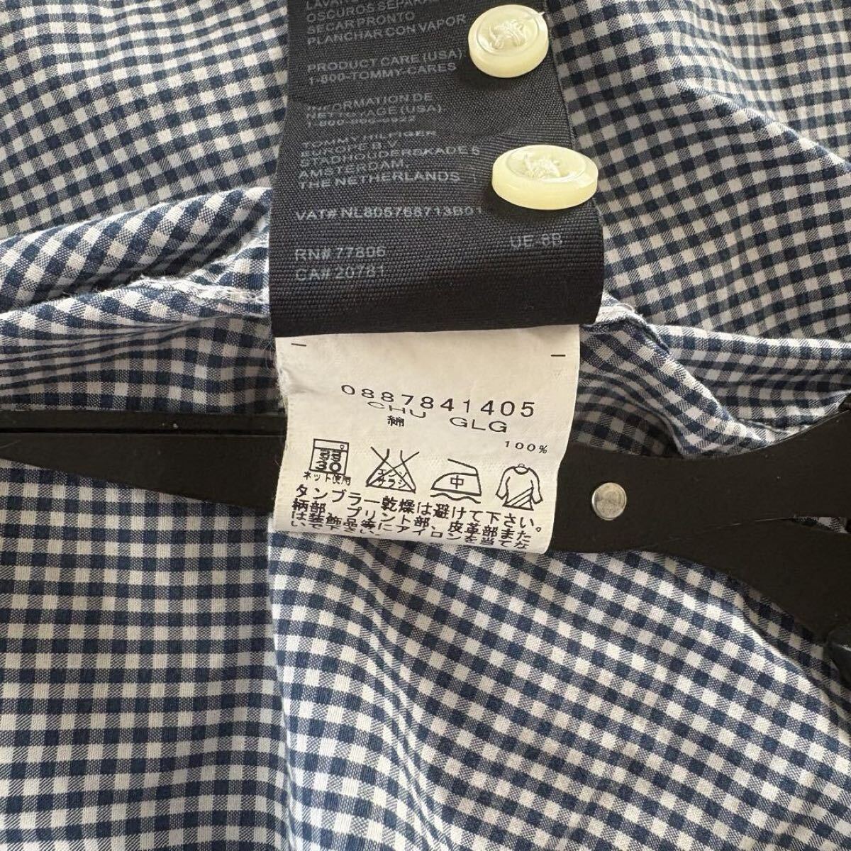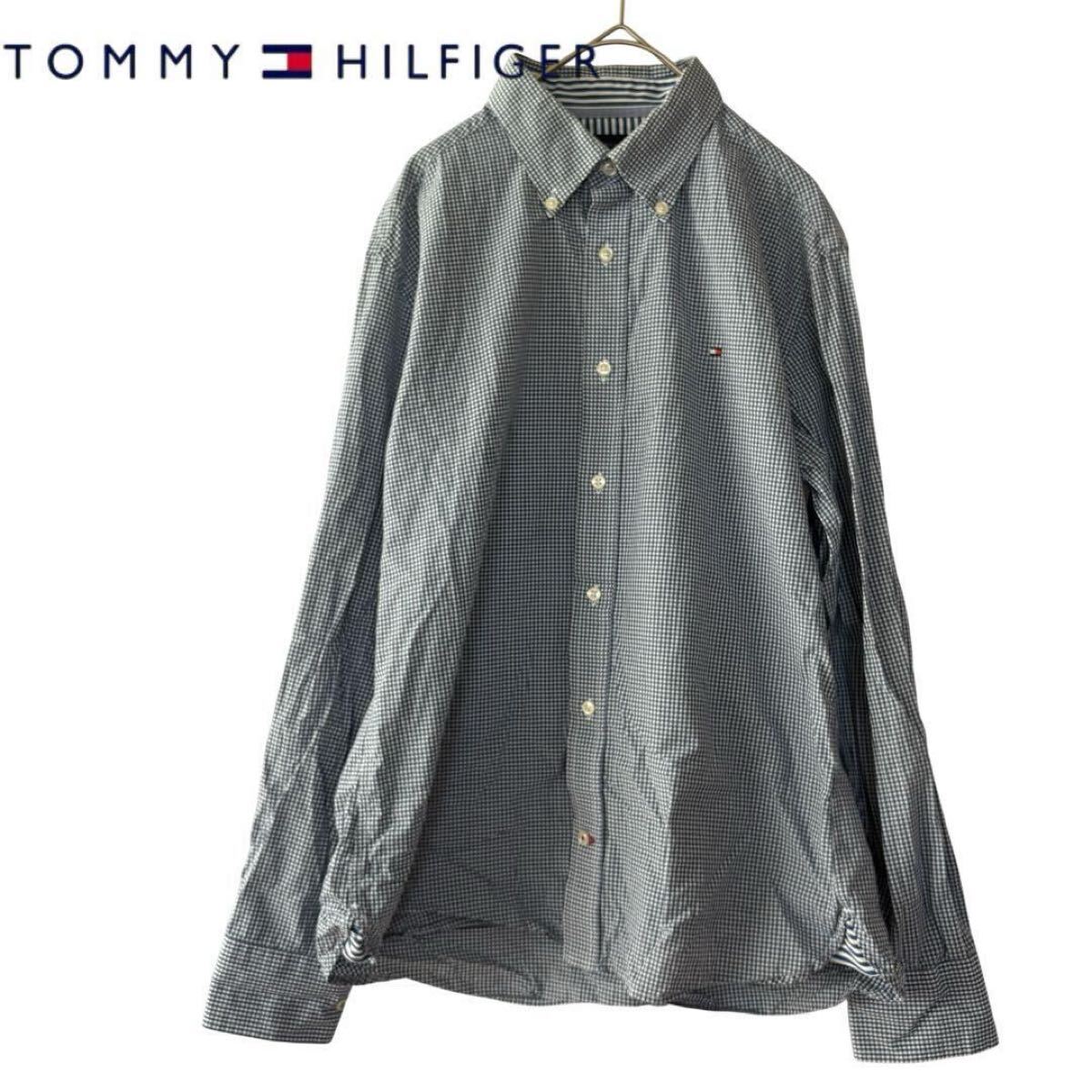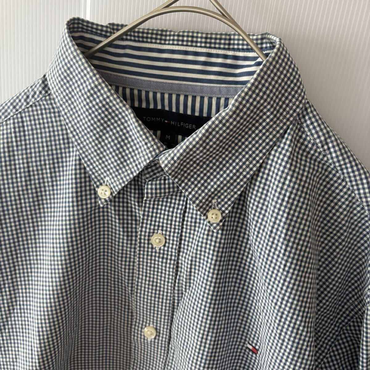 ブルー系のギンガムチェック柄、ボタンダウンカラーの長袖シャツ。