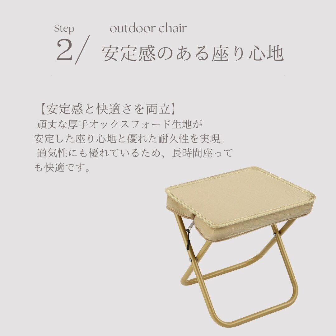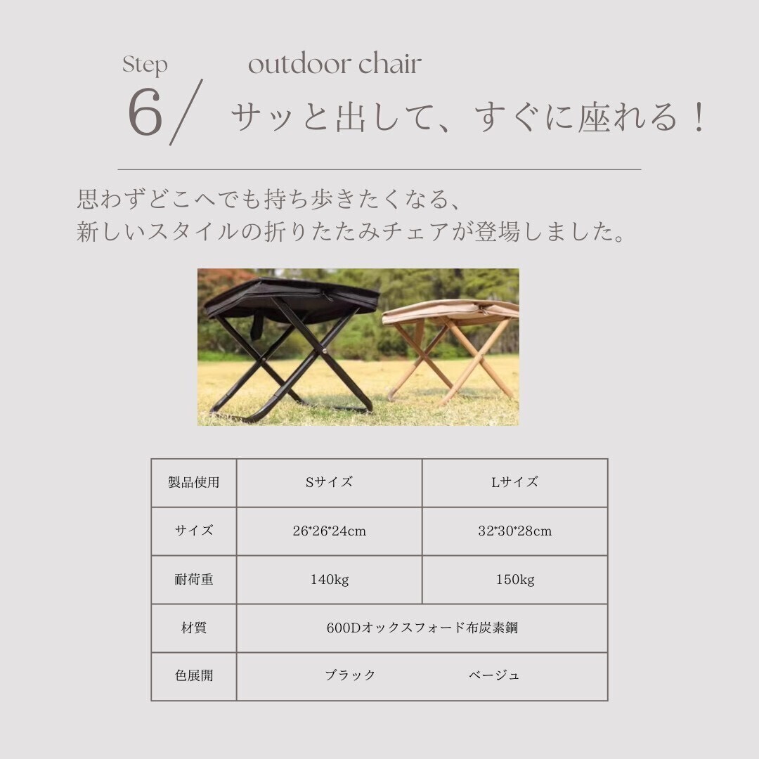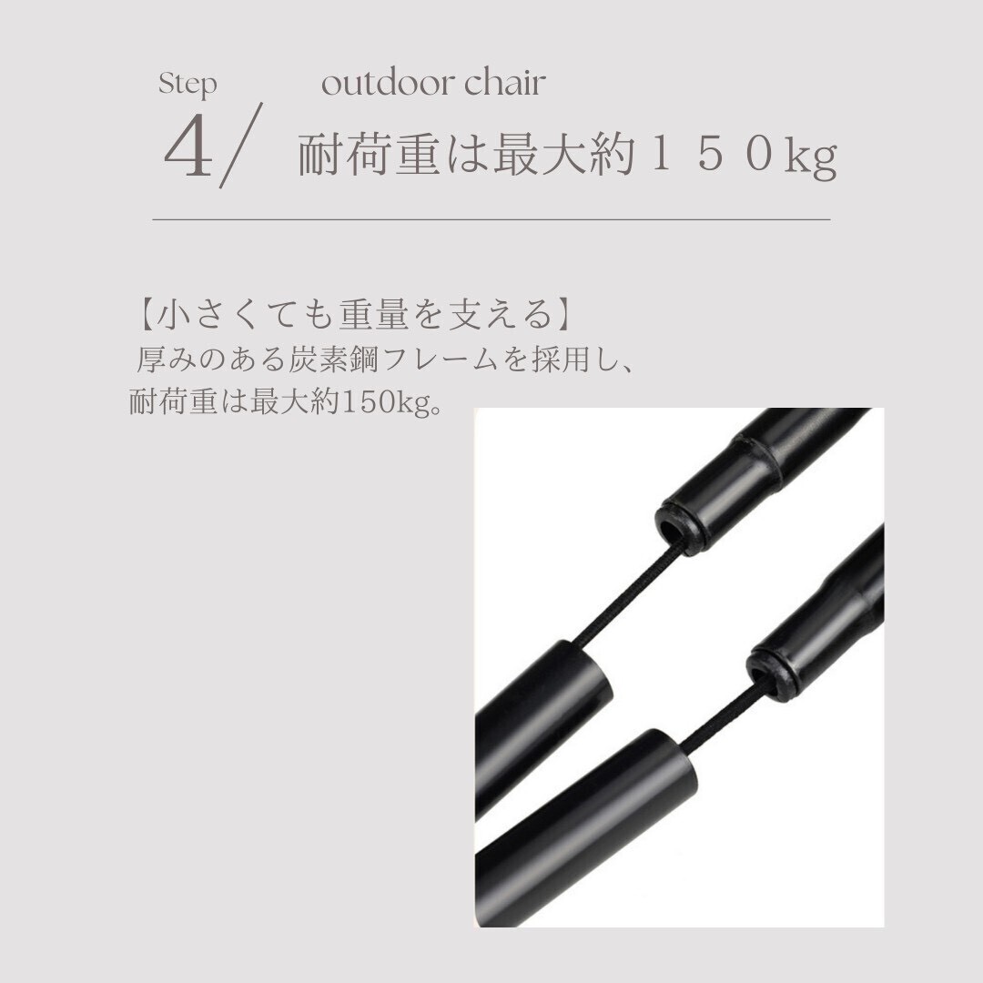 椅子の脚は強度の高い、炭素鋼のクロス構造を採用。十分な強度を確保しながら、可能な限りの軽量化で片手で持ち運びできます。お出かけに最適です!