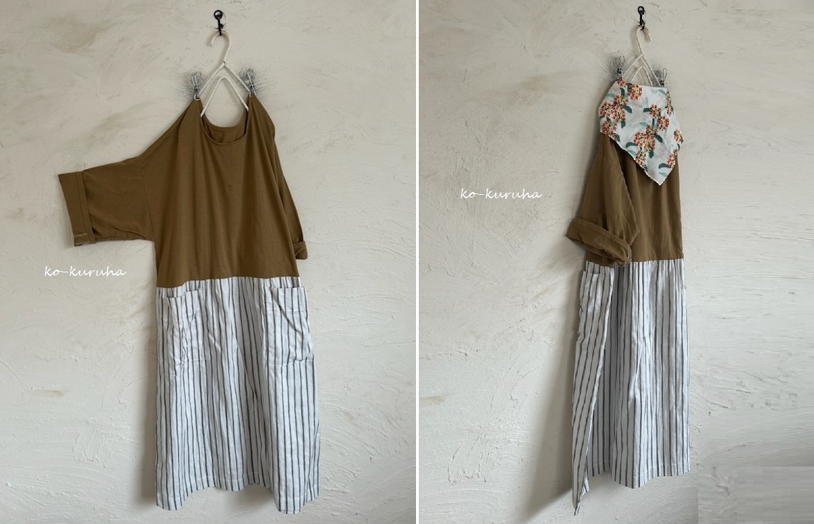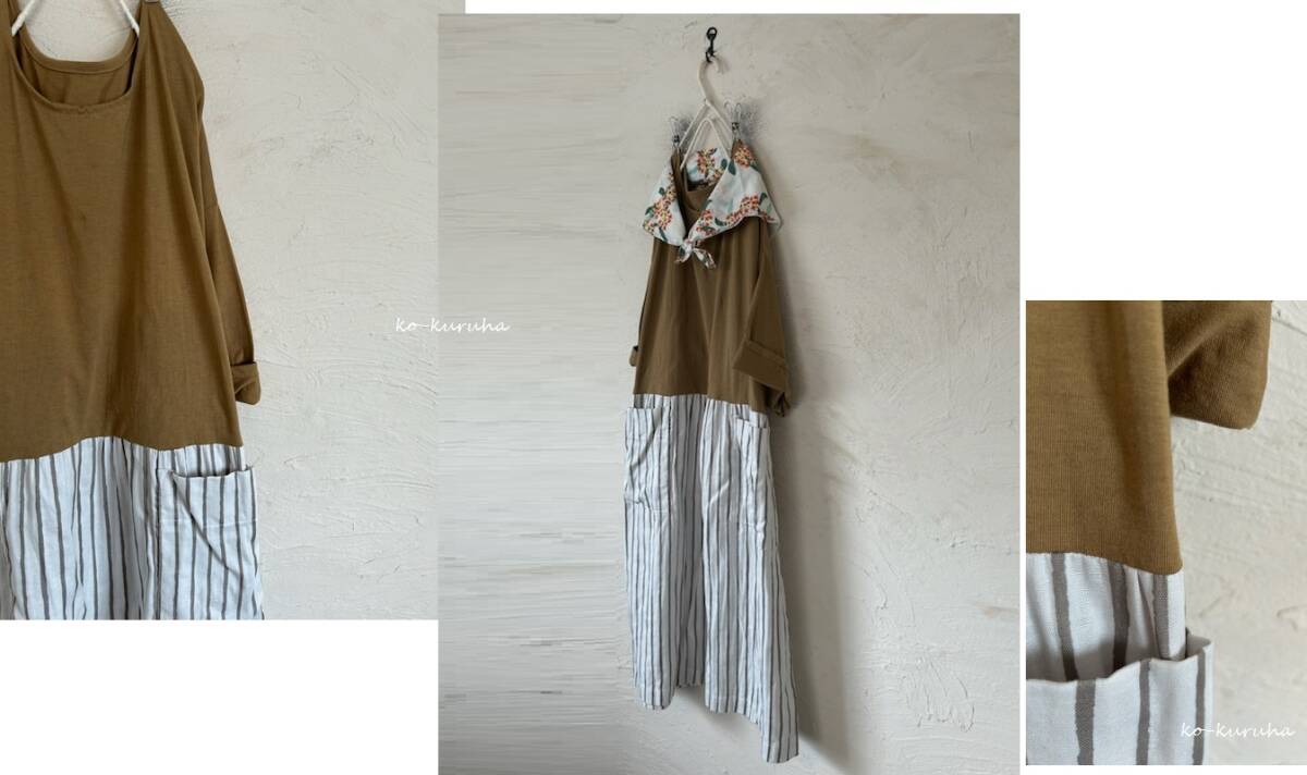 ★キャメル天竺ニット×手書風ストライプダブルガーゼ。替ギャザーOP ★ |