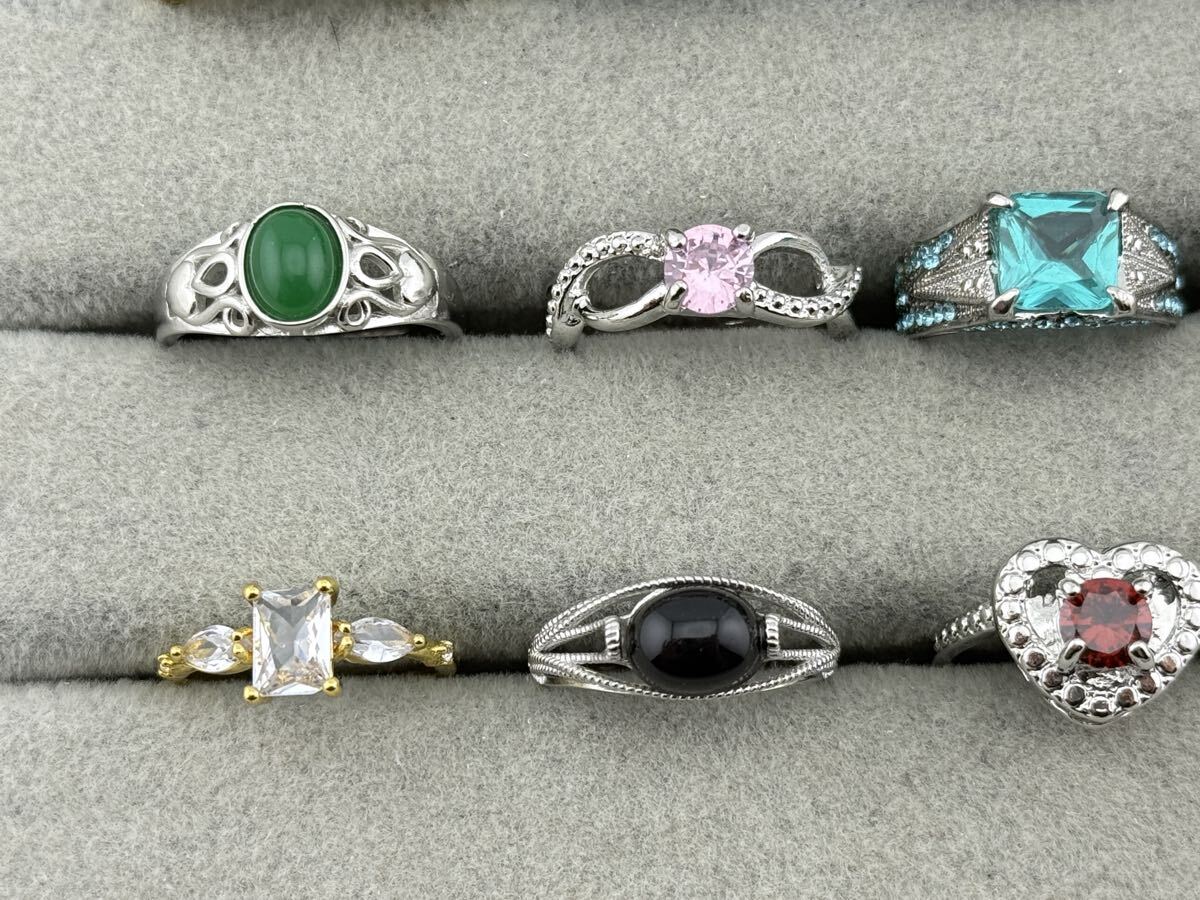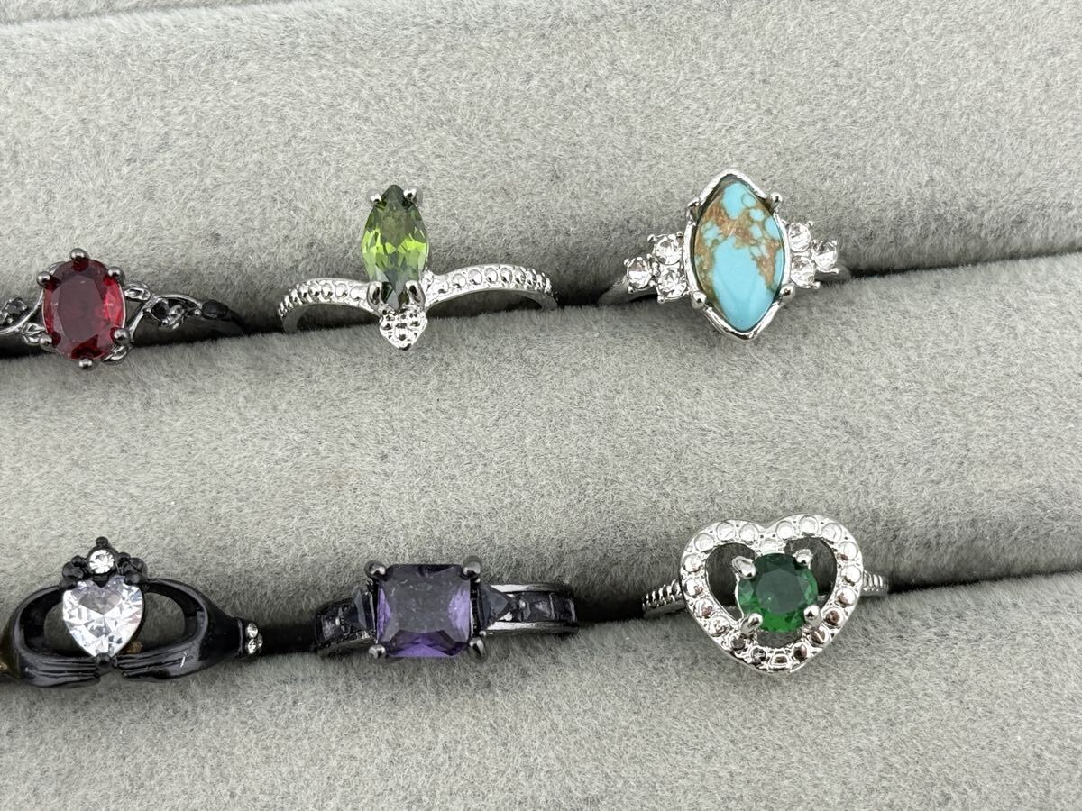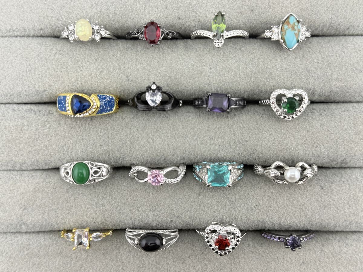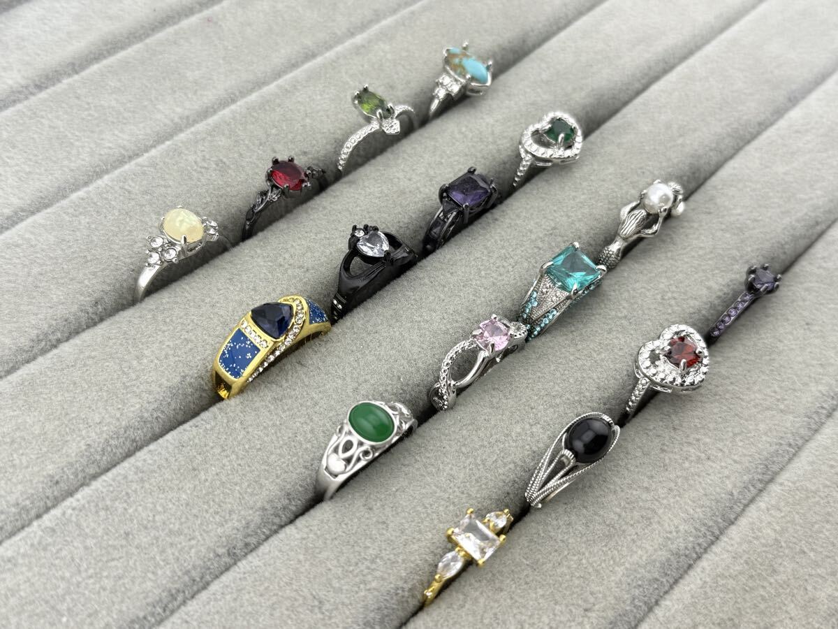 天然石、ジルコニア 、カラーストーン、色ガラス、ゴールド、シルバー、ステンレス、真鍮など様々です。