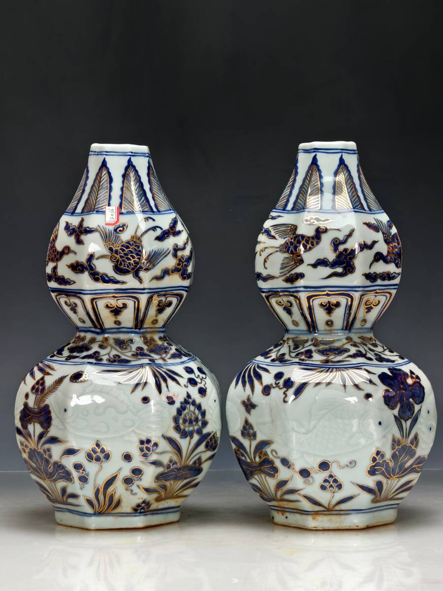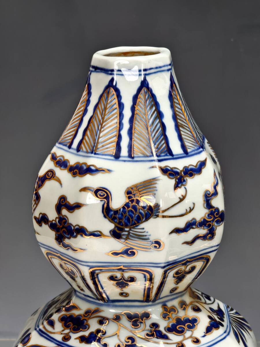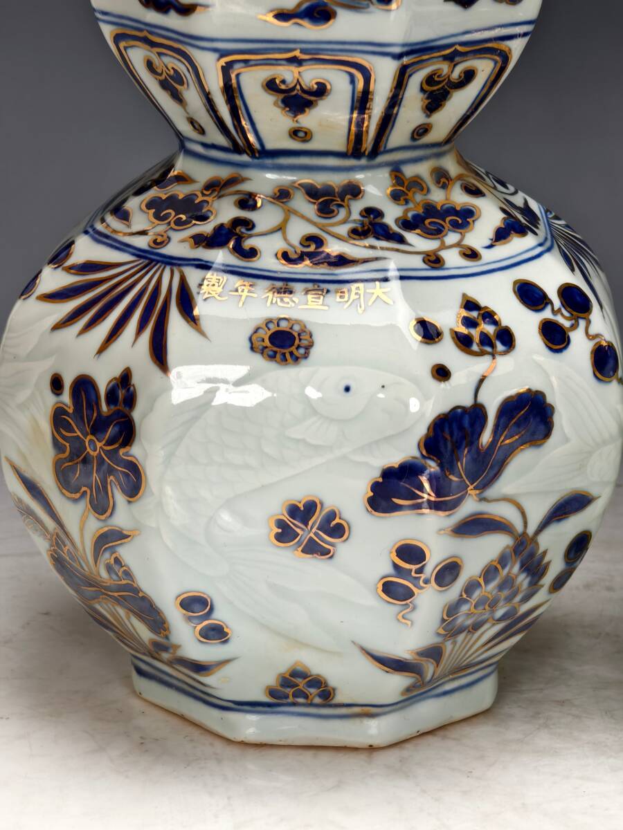 | 中国磁器 陶芸 磁器『【大明宣徳】青花蒔金暗飾刻磁鳳凰魚紋瓢瓶(ひょうたんびん)』施釉陶 古代工芸品 陶芸 精美彫 置物 收藏品 | |||