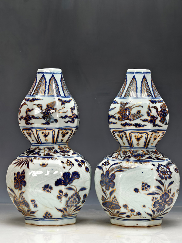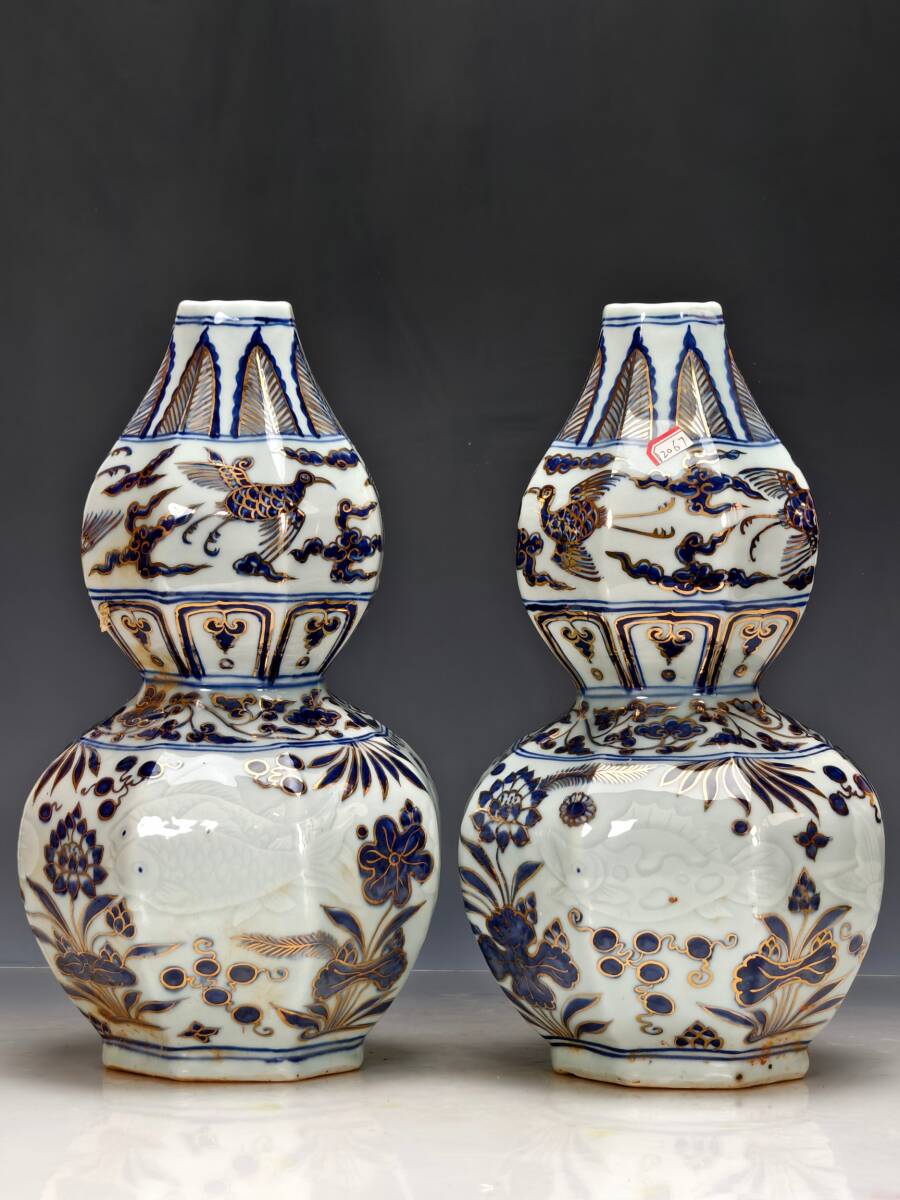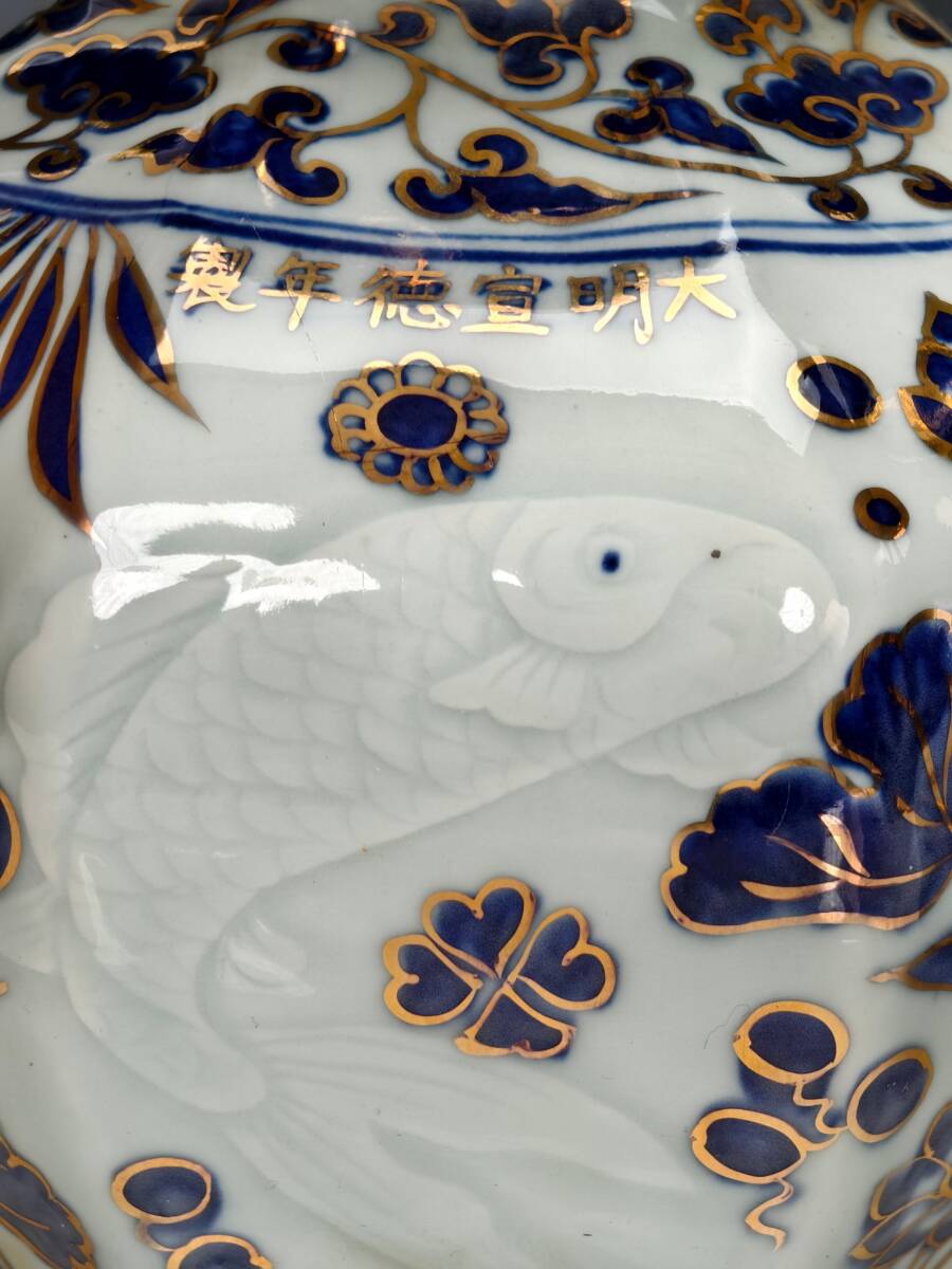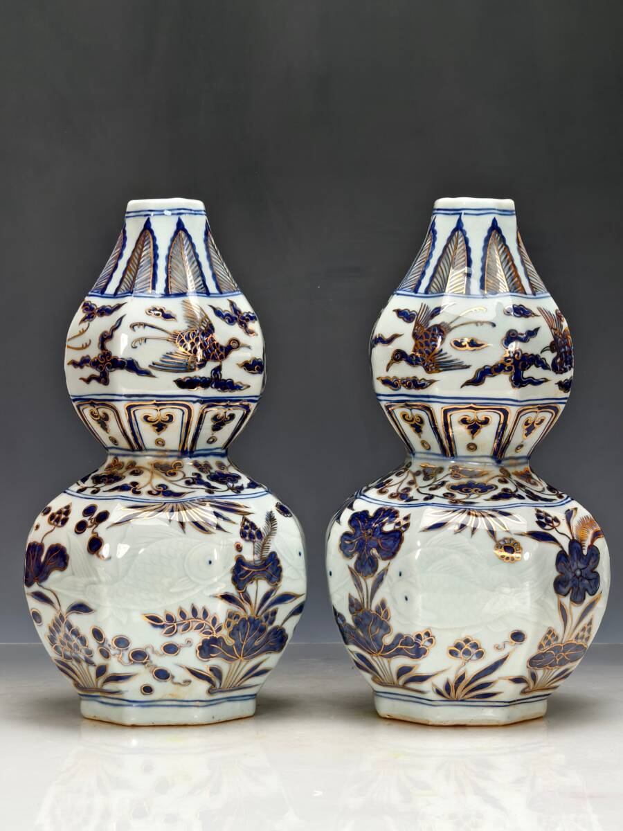 | 中国磁器 陶芸 磁器『【大明宣徳】青花蒔金暗飾刻磁鳳凰魚紋瓢瓶(ひょうたんびん)』施釉陶 古代工芸品 陶芸 精美彫 置物 收藏品 | |||