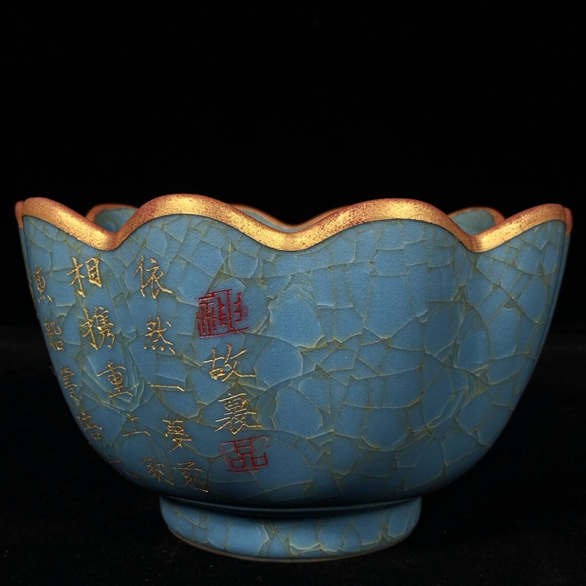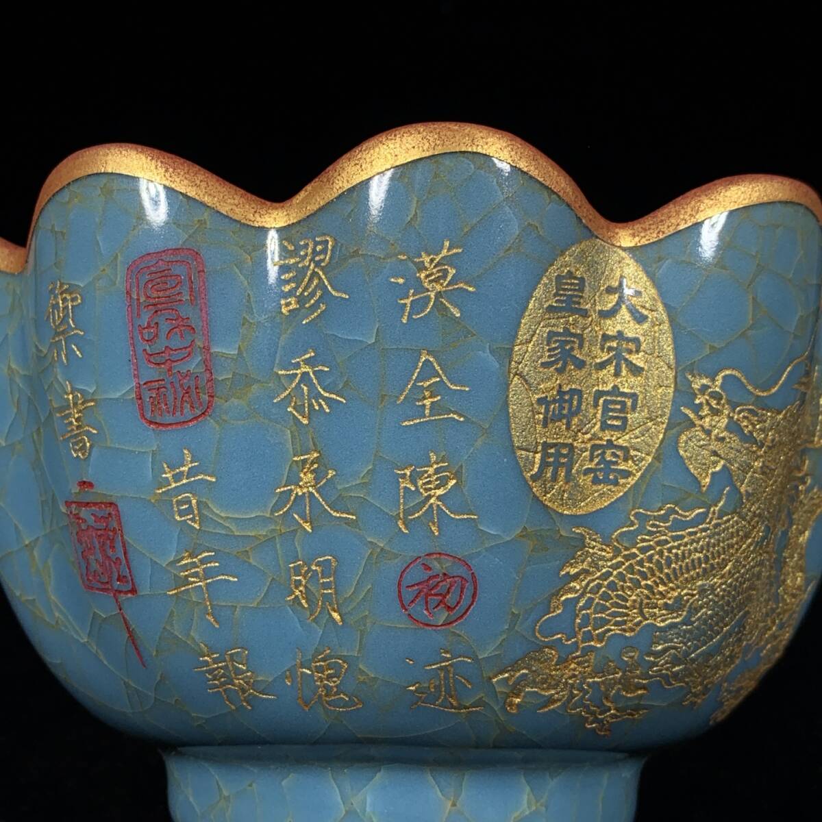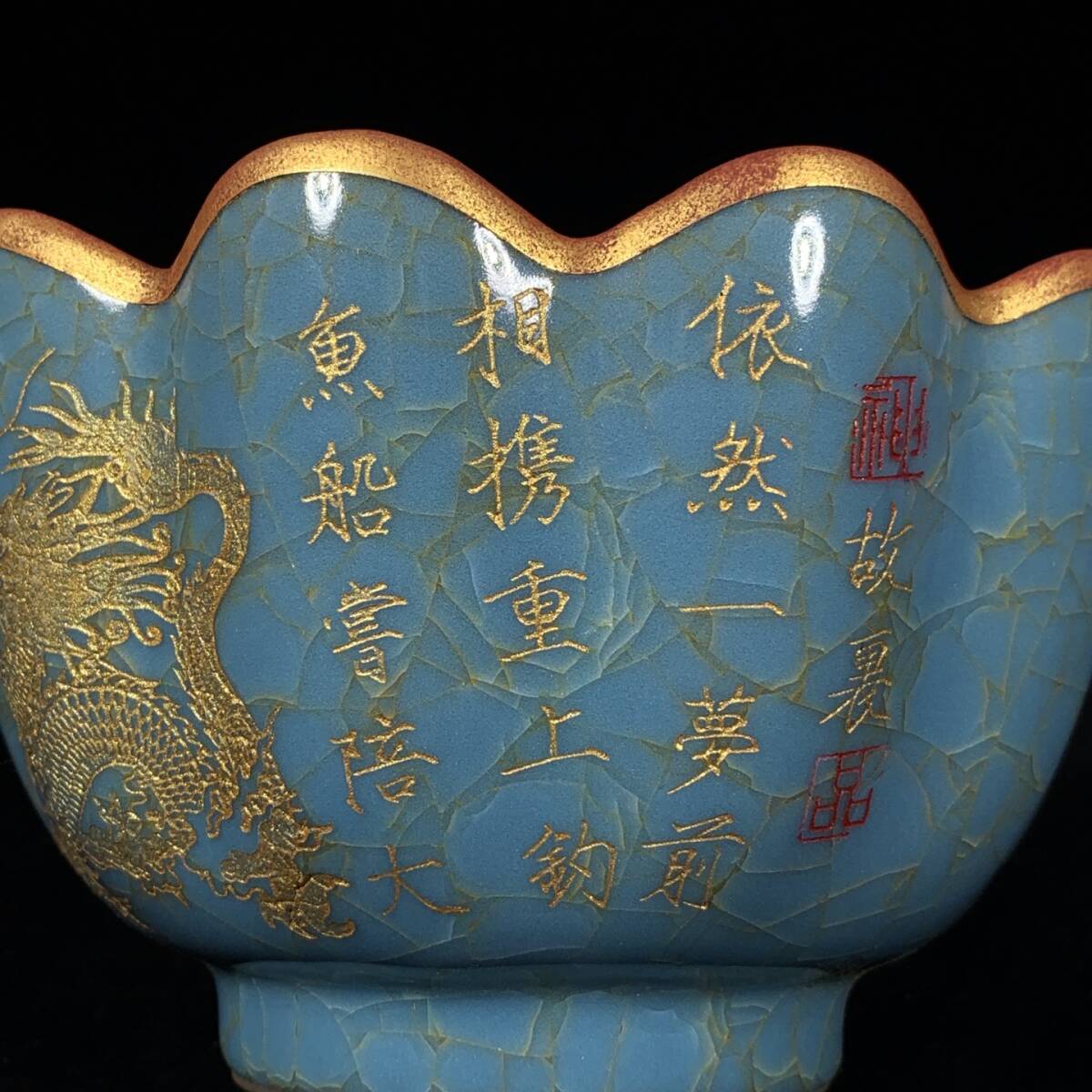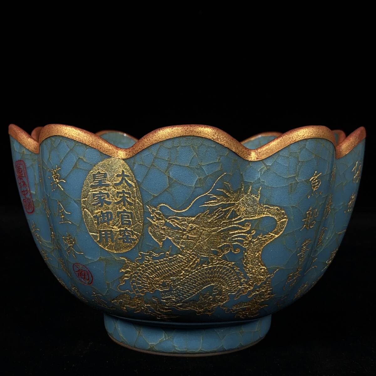 宋時代 京 官窯 氷割れ宝藍釉 金包口銘文彫刻 龍紋蓮華宝碗 古陶磁器 唐物 古賞物 時代物 骨董品 古美味 旧家蔵出 中国古玩 古美術品