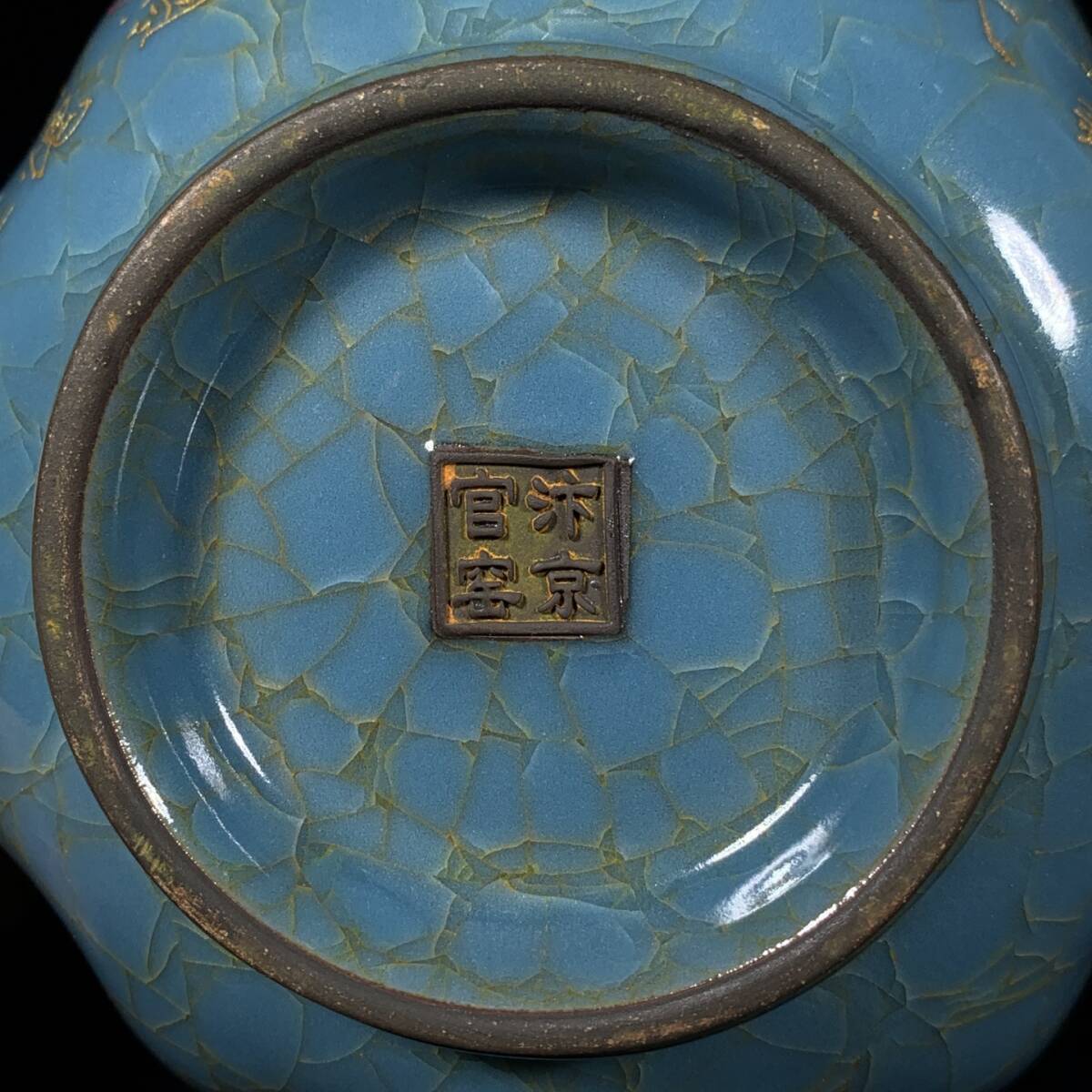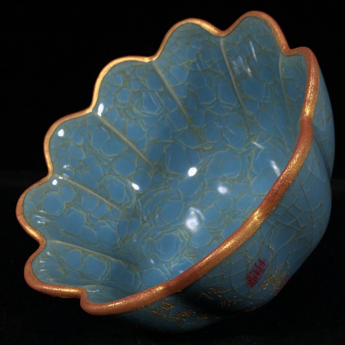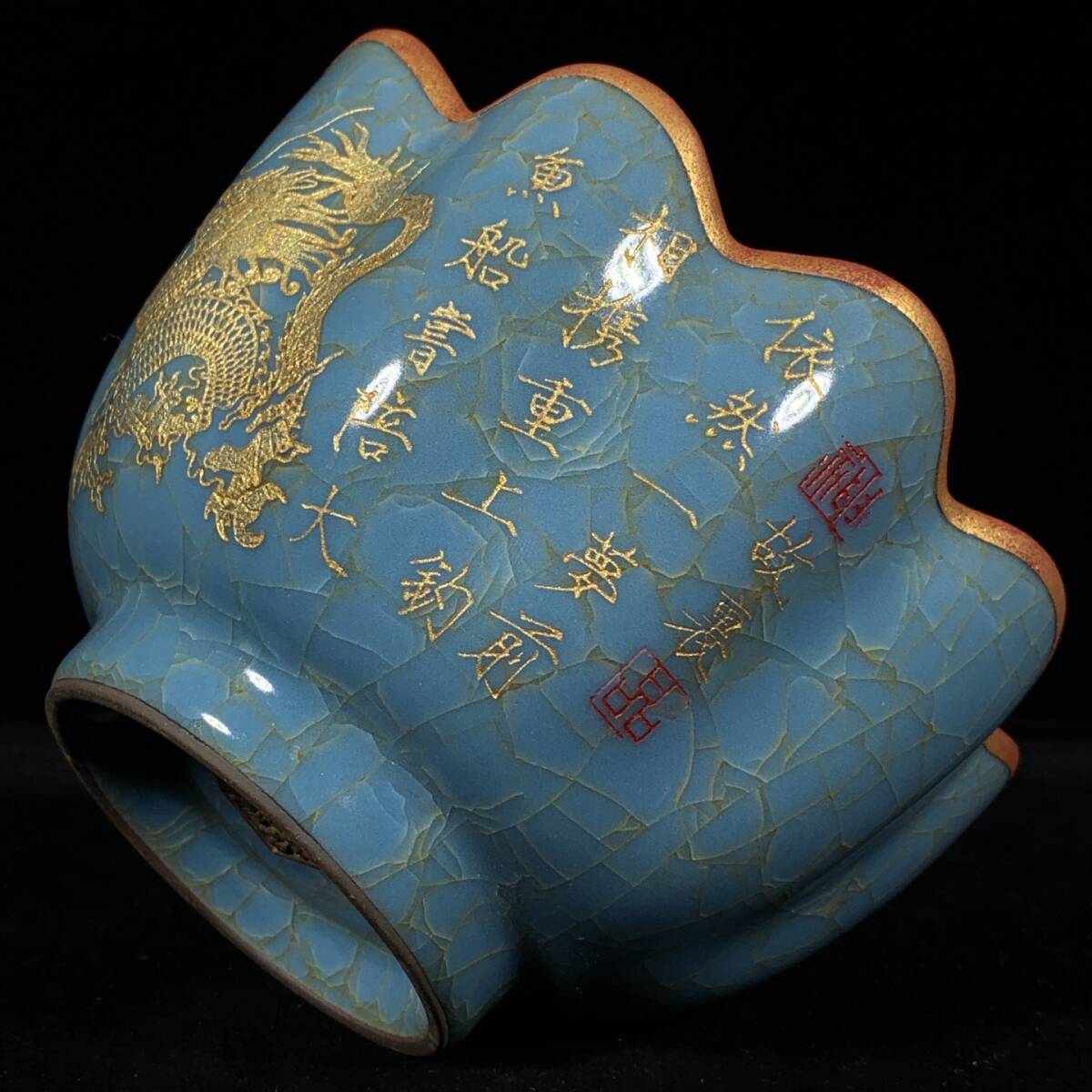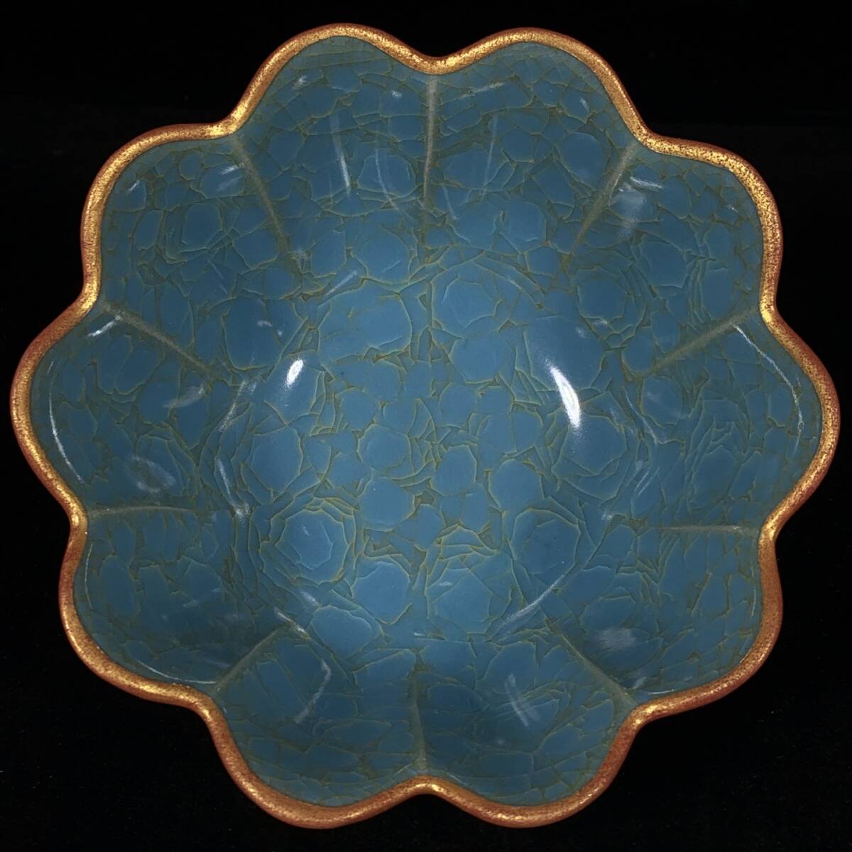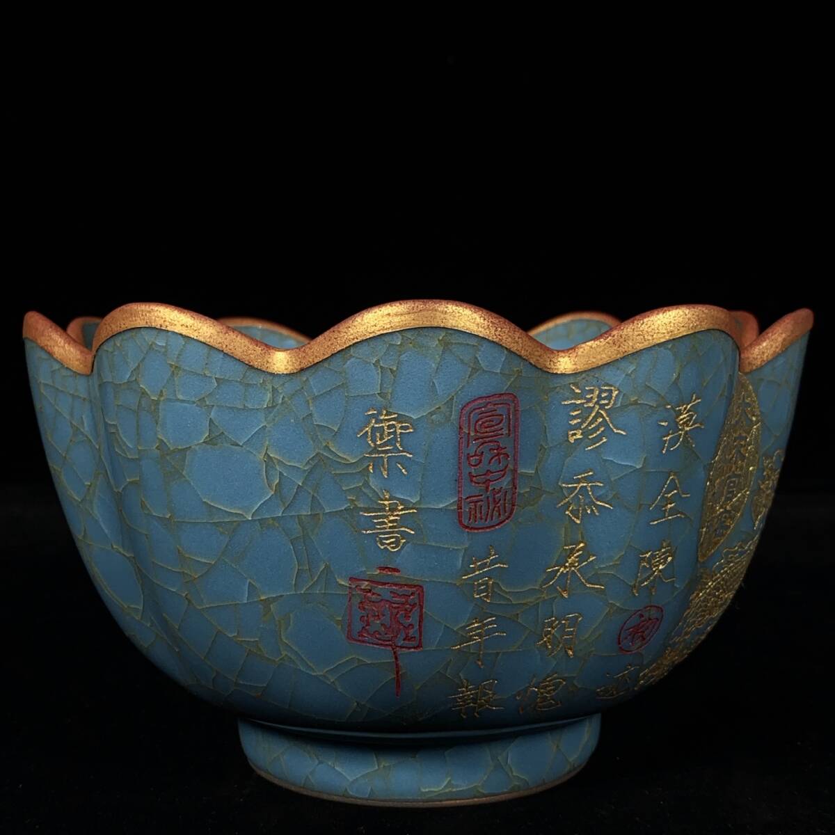宋時代 京 官窯 氷割れ宝藍釉 金包口銘文彫刻 龍紋蓮華宝碗 古陶磁器 唐物 古賞物 時代物 骨董品 古美味 旧家蔵出 中国古玩 古美術品