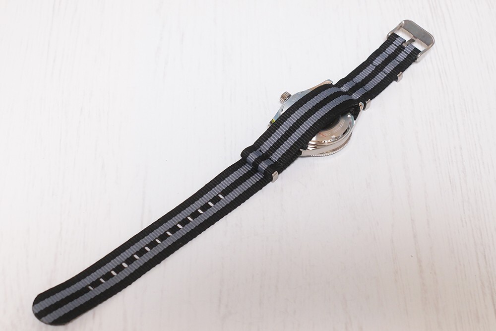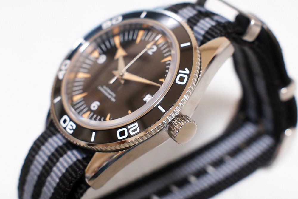 007 スペクターでジェームズボンドが着用していたモデルのシーマスターからオマージュしたと思われるデザインです。文字盤、リューズ、バックル等全てロゴなしの潔いデザイン。