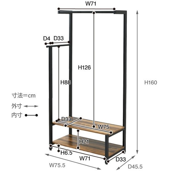 【カラー】 ブラック×ブラウン 【サイズ】 <外寸> 幅75×奥行45×高さ160cm <内寸> ハンガー大:幅71×高さ126cm ハンガー小:奥行33×高さ88cm フック:出幅4cm 棚間:幅71×奥行33×高さ21cm 脚間:幅71×奥行33×高さ6.5cm 【材質】 フレーム:スチール(粉体塗装) 棚板:合成樹脂化粧パーティクルボード(メラミン樹脂) 【耐荷重】 ハンガー大:(約)10kg以下 ハンガー小:(約)7kg以下 棚:各(約)10kg以下 【収納数】 ハンガー大:(約)14~23着 ハンガー小:(約)6~10着 【生産国】 中国 【梱包】 サイズ:97×47.5×14cm、重量:14.5kg 【その他】 ・六角レンチ同梱 ・商品によって色味や木目などの風合いが異なります。 【組み立て品】 お客様による組み立てが必要です。 【ご注意】 ・サイズ、重量は概算です。 ・商品カラーはご使用のモニターによって実際の明るさや色と異なって見える場合がございます。 |